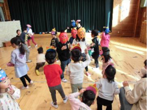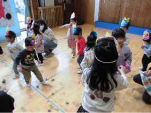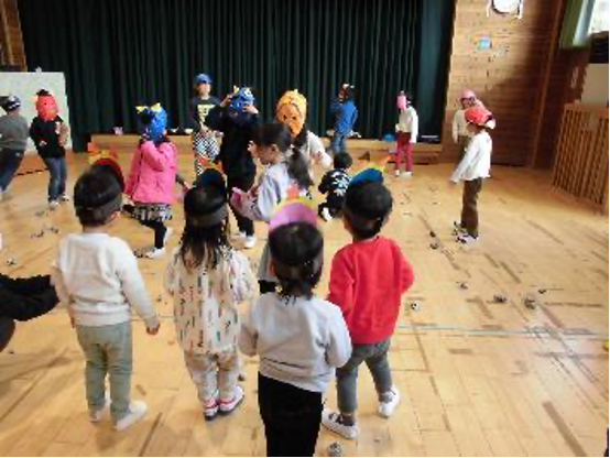 手作りのお面を付けて、豆まきごっこをしました。