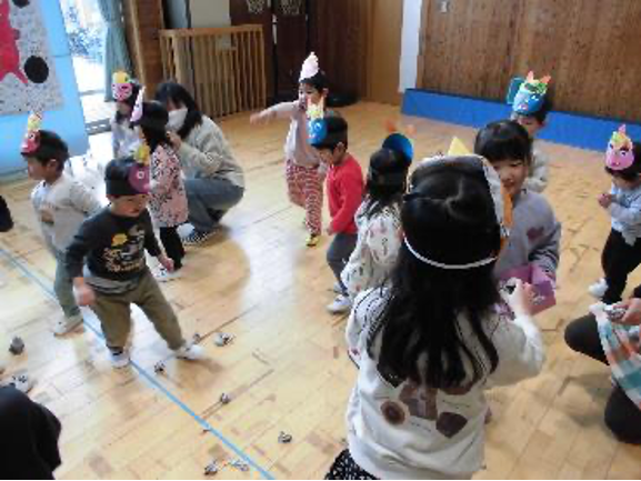 ・2歳児:5歳児の子が保育室まで迎えに来てくれた。交流が深まり、豆まきごっこをたっぷりと楽しむことができた。