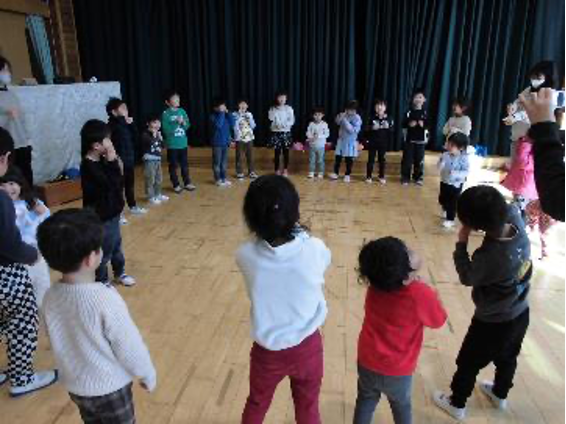 5歳児がクラスで楽しんでいるダンスを教えてもらいながら一緒に踊りました。