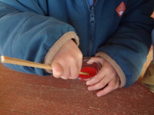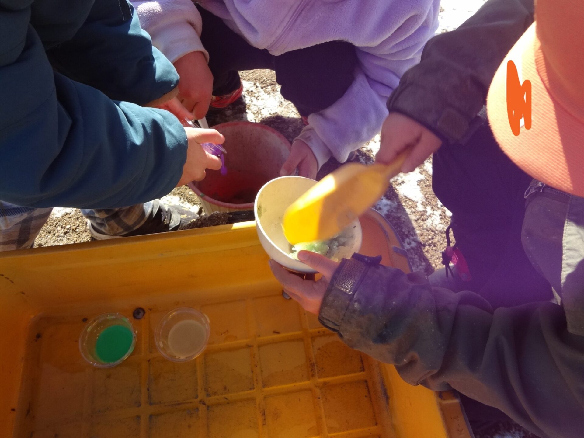 「どんな色になるかな?」「混ぜる棒がいるね」「混ぜ混ぜ棒を探せ~!!」