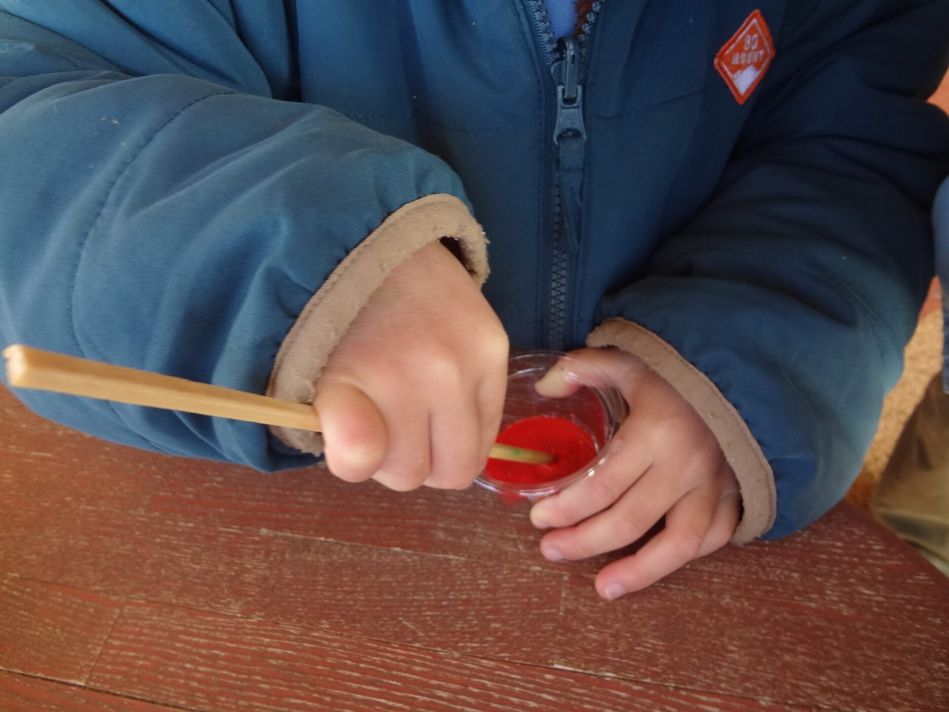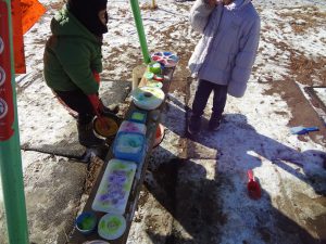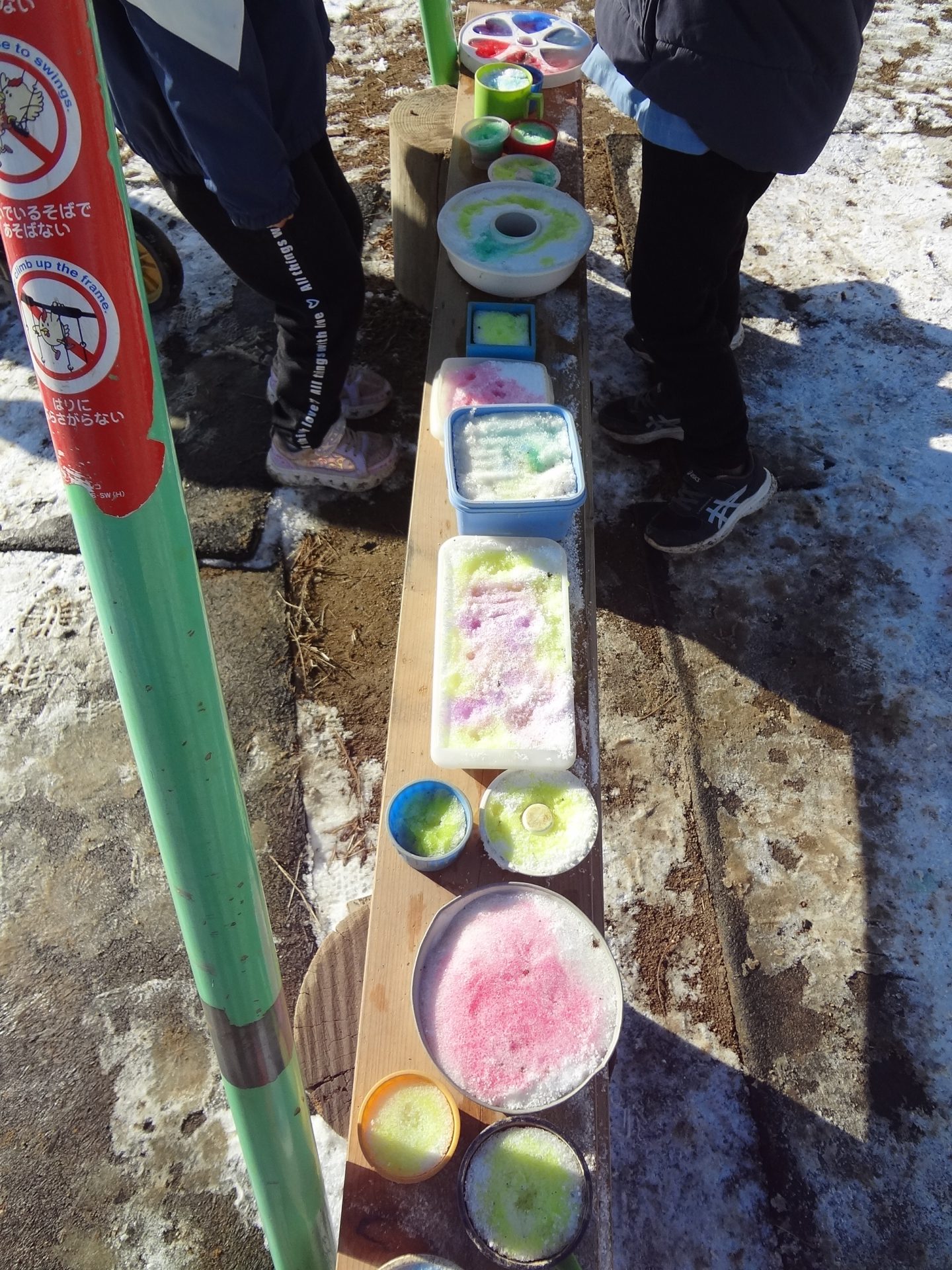 ちなみに、、、2月に入り、やっと冬らしい気温の日が続き、午前中に作った色水がおやつの時間には氷に!!