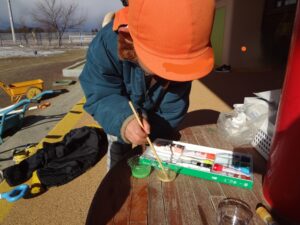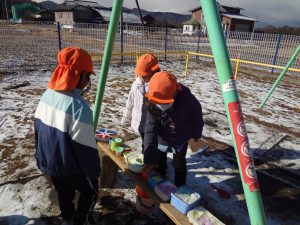 うっすらとした雪でしたが、肥料袋を使っての赤土山滑りやかき氷屋さん、雪遊びなどを楽しむことができた1日。