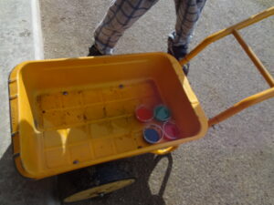 色実験をしていると介護織屋さんをしていた子が気づき「その色きれい✨ちょっとちょうだい」と話しかけてきました。「うん。いいよ」「じゃあ、トラックに載せて俺が売りに行く!」