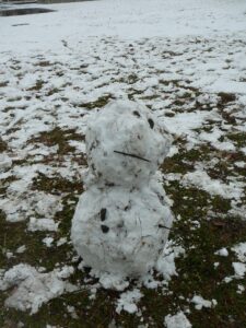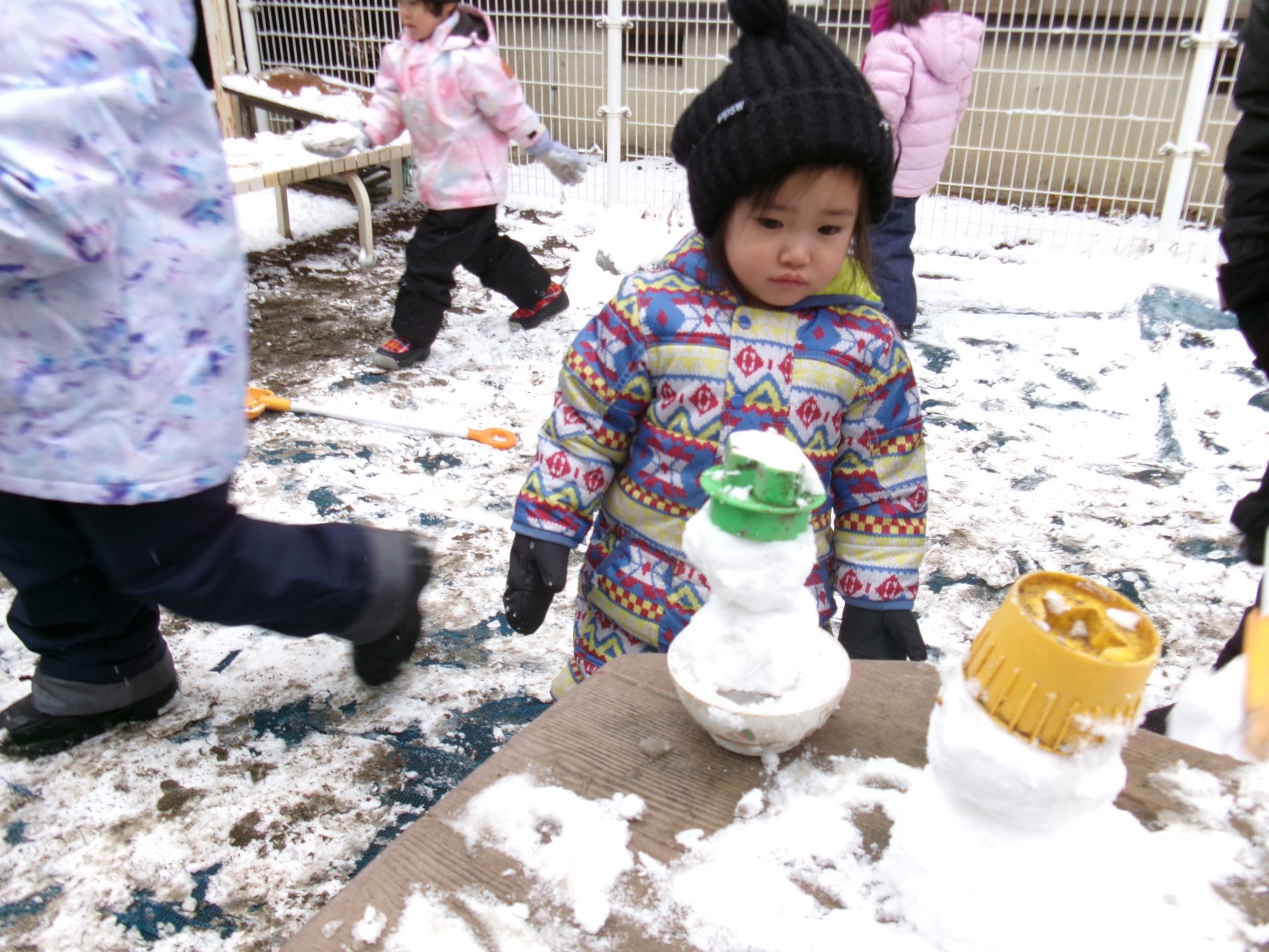 広場のあちこちから雪を集めて、高さ60cmほどのかわいい雪だるまができました!みんなで力を合わせて作った雪だるま、ステキにできたね。ん?よく見ると、なんだか雪だるまさん空を見上げて”もっとゆきがふらないかなぁ・・・”って思っているみたい。また雪で遊べるといいね。