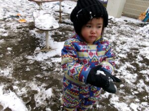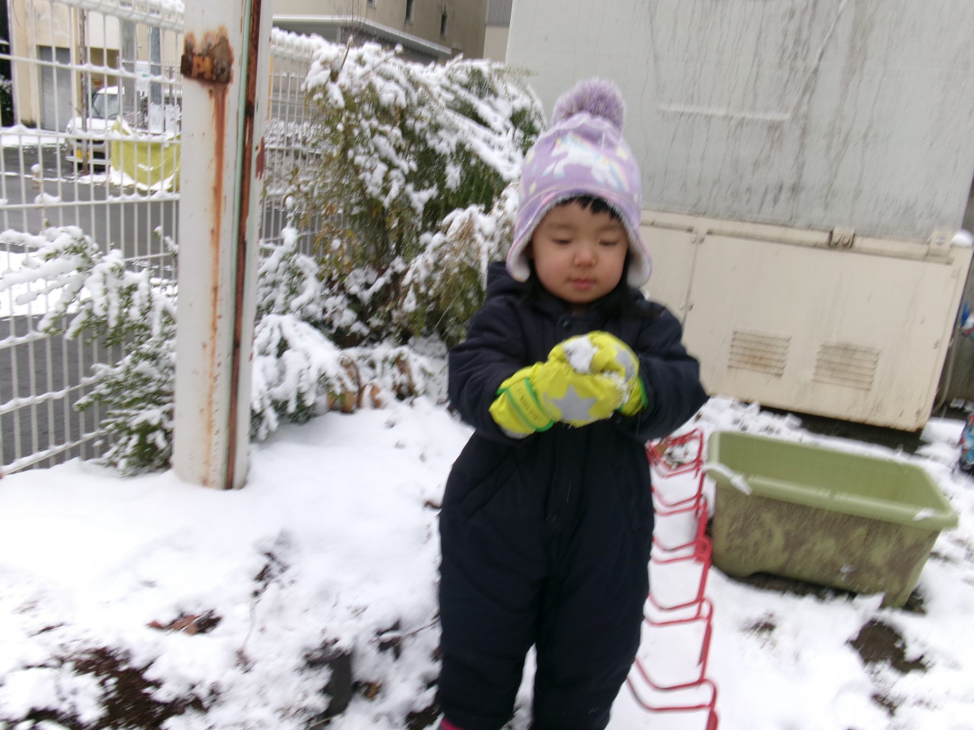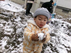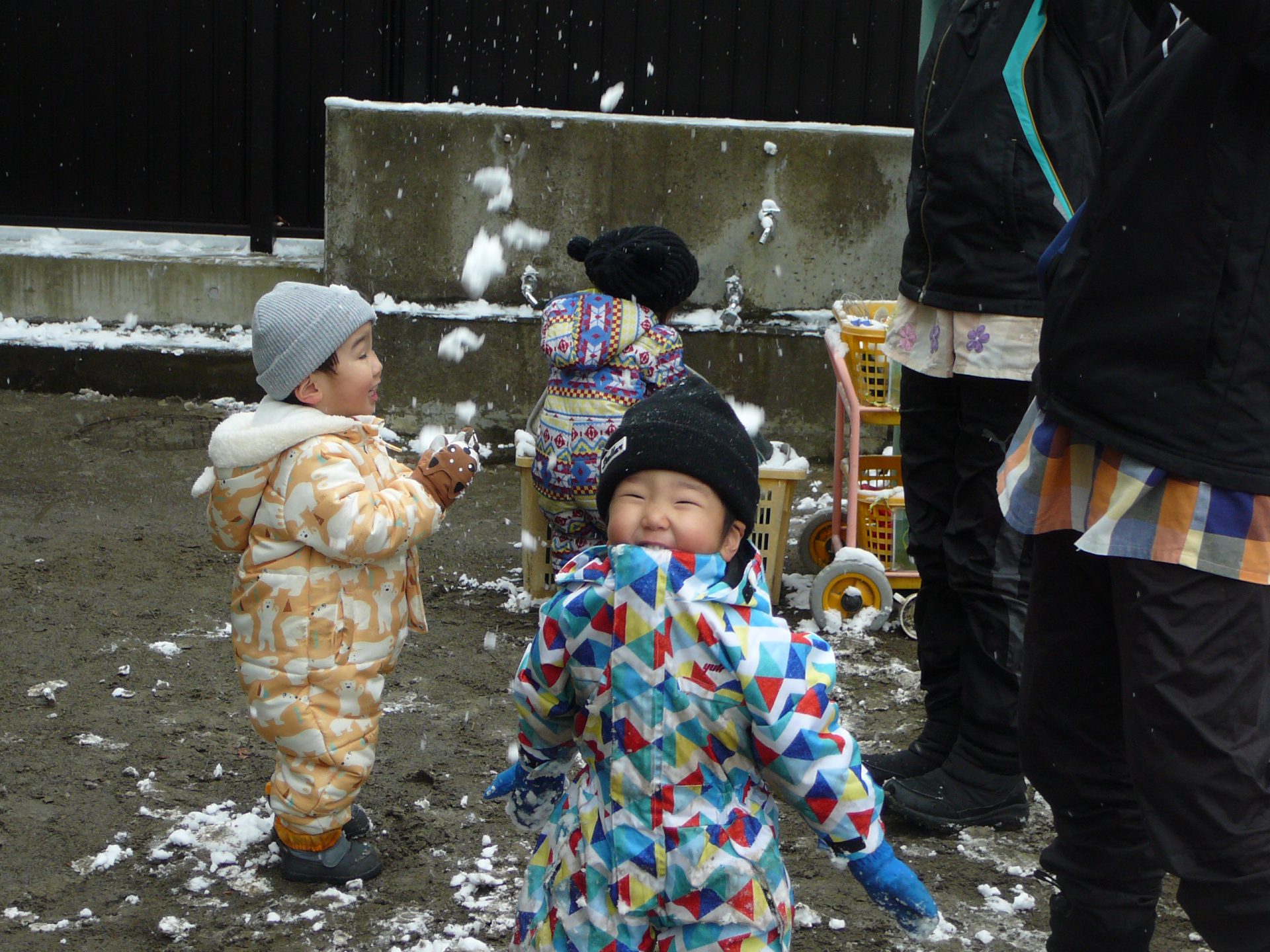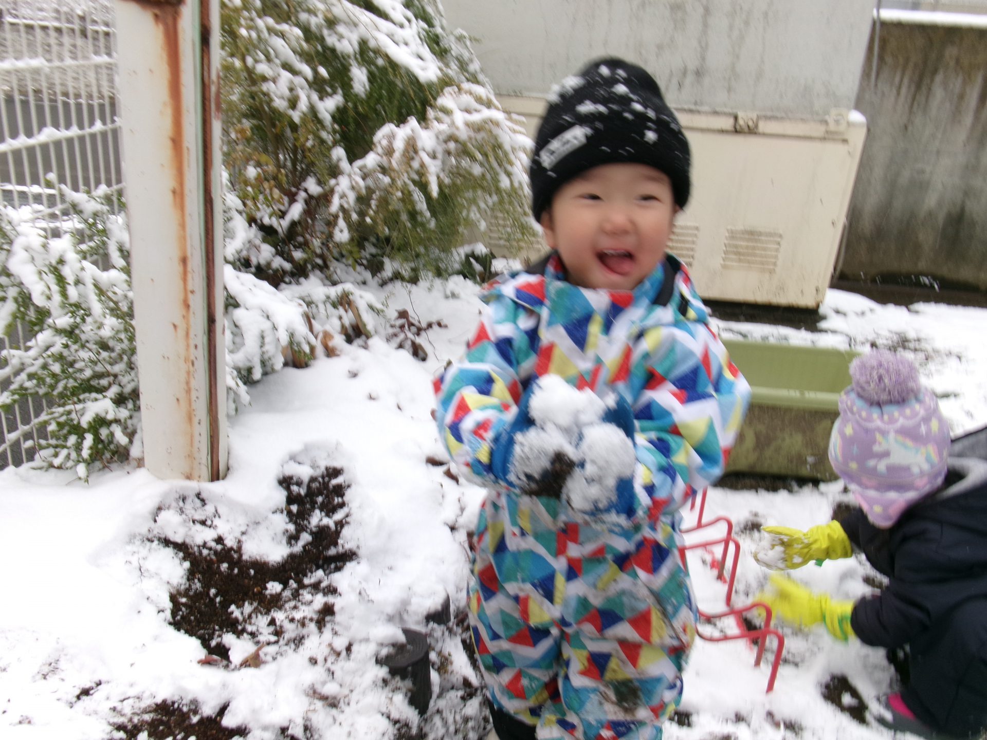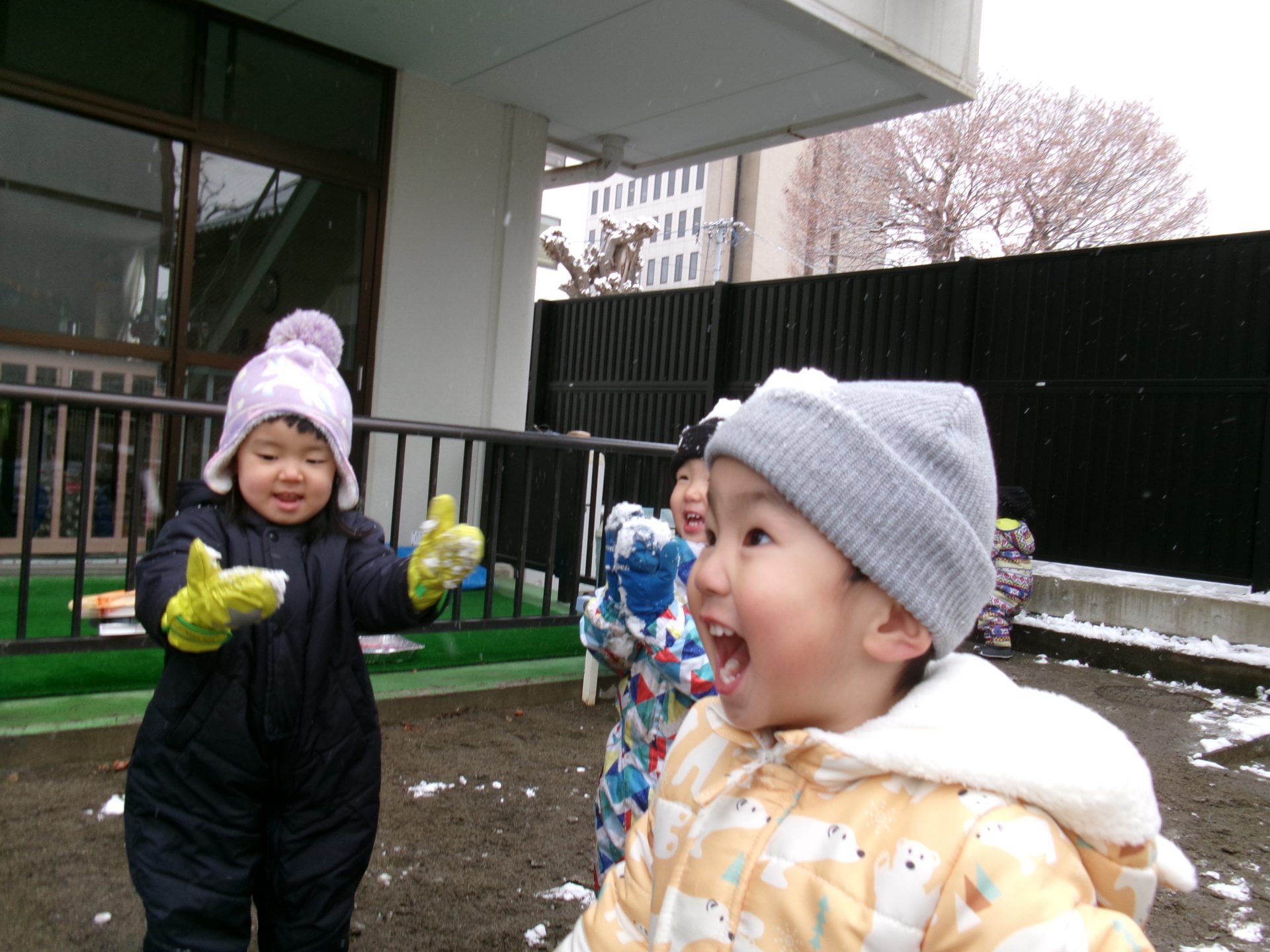 今日は久しぶりに地面に雪が積もりました。雪を待っていた子供達は大喜び。早速広場へ飛び出していきました。