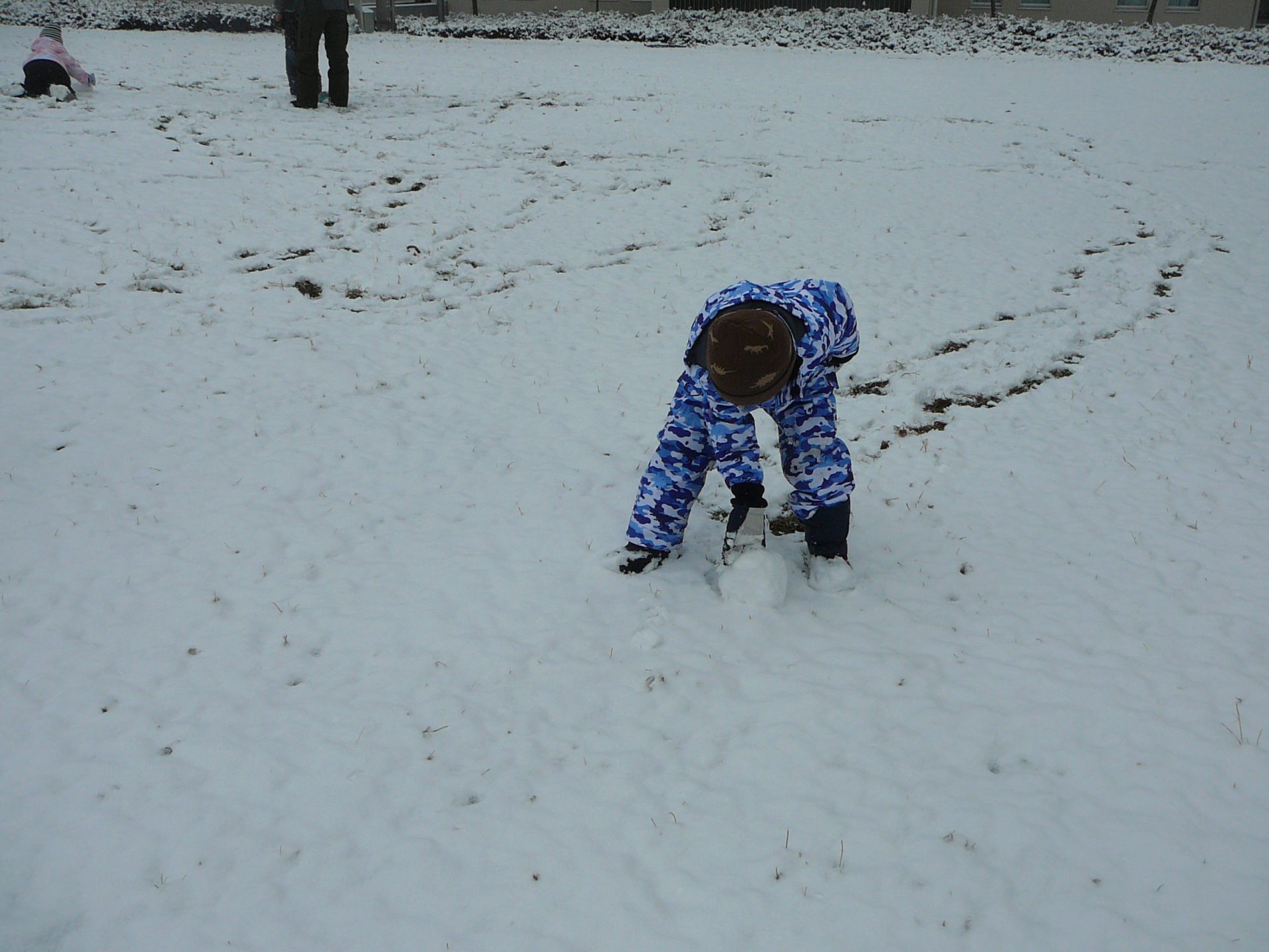 雪玉を転がして、雪だるまづくり。根気のいる作業ですが、一生懸命転がします。