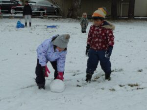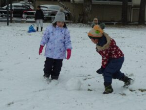 年長さんは「二人で協力して丸めるから、まかせて!」と頼もしい言葉。二人で力を合わせて大きな雪玉を作ってくれました。