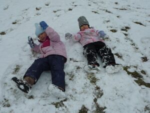 雪の上に寝っ転がってみました。「顔に雪降ってきて、つめたーい!」とニコニコ顔で寝転んでいました。