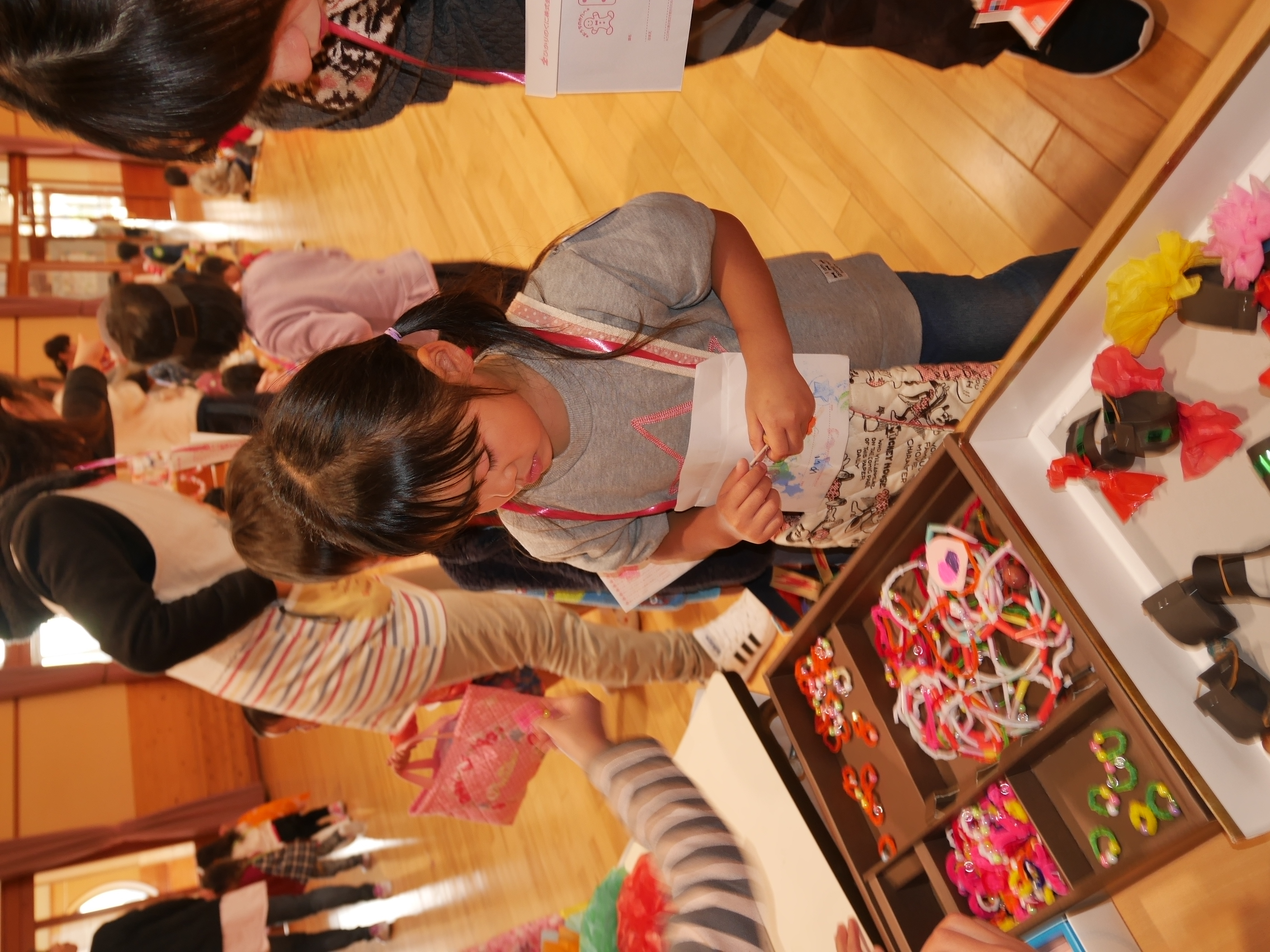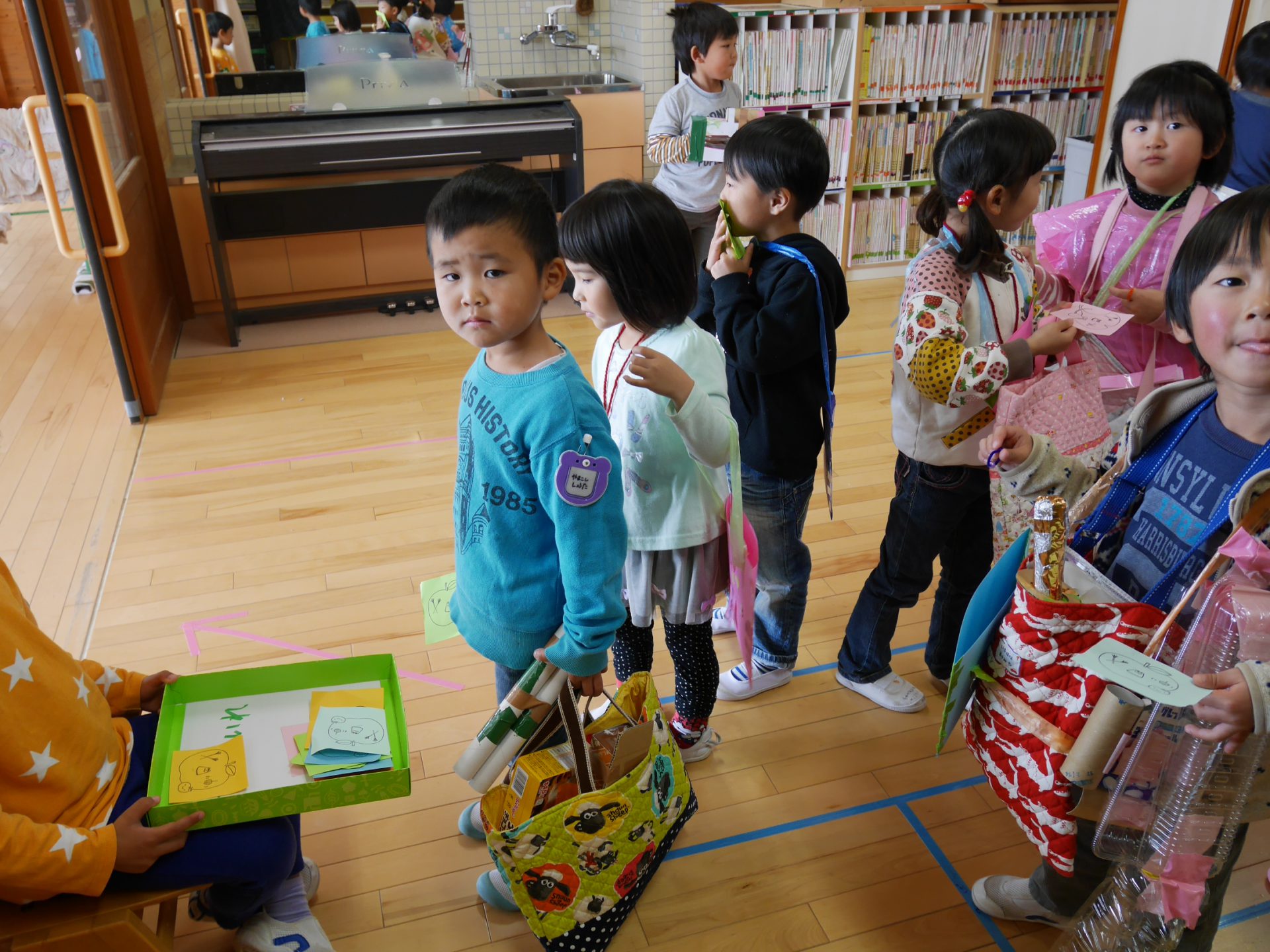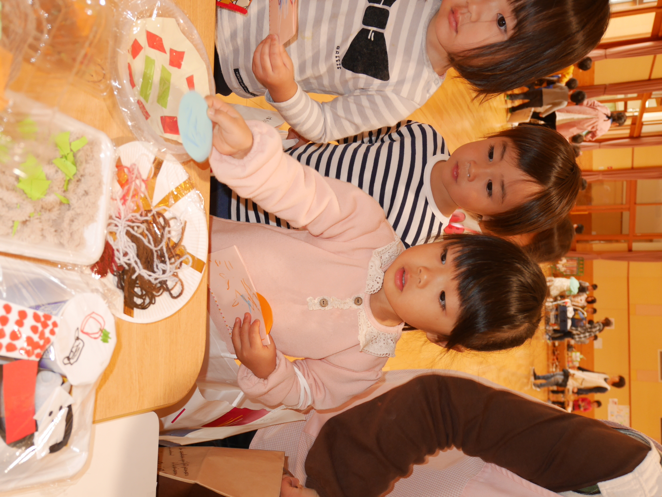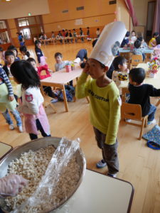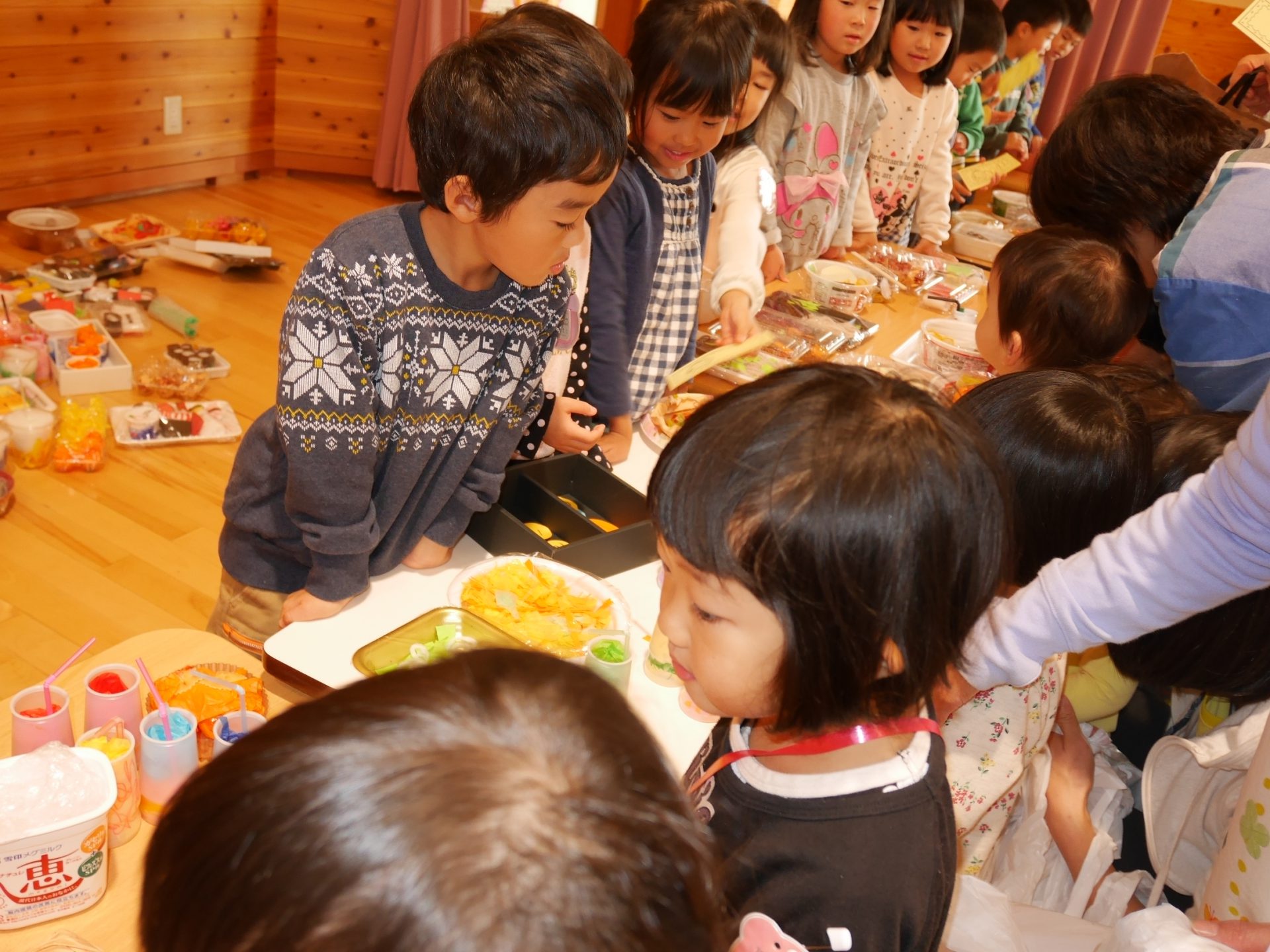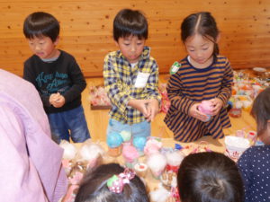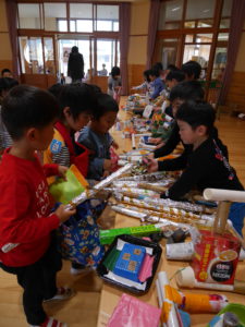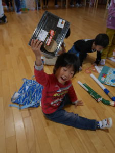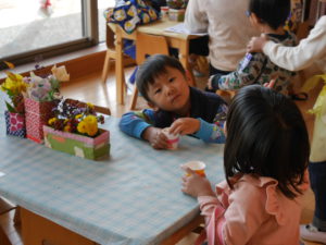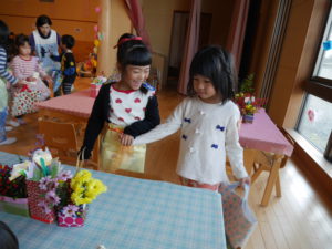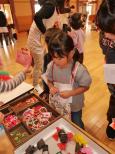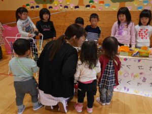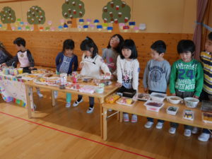 開店の時、小さい子が困らないように教えてあげる。「自分で出来るように」教えてあげる。今までの経験の中で3クラスが集まって作ってきたことを積み重ねていくうちにお店屋さんで必要な「もの」や「こと」がたくさん出て形になりました。年中さんが「年長さんてやっぱりすごいね!」と友達と会話をしていました。