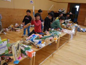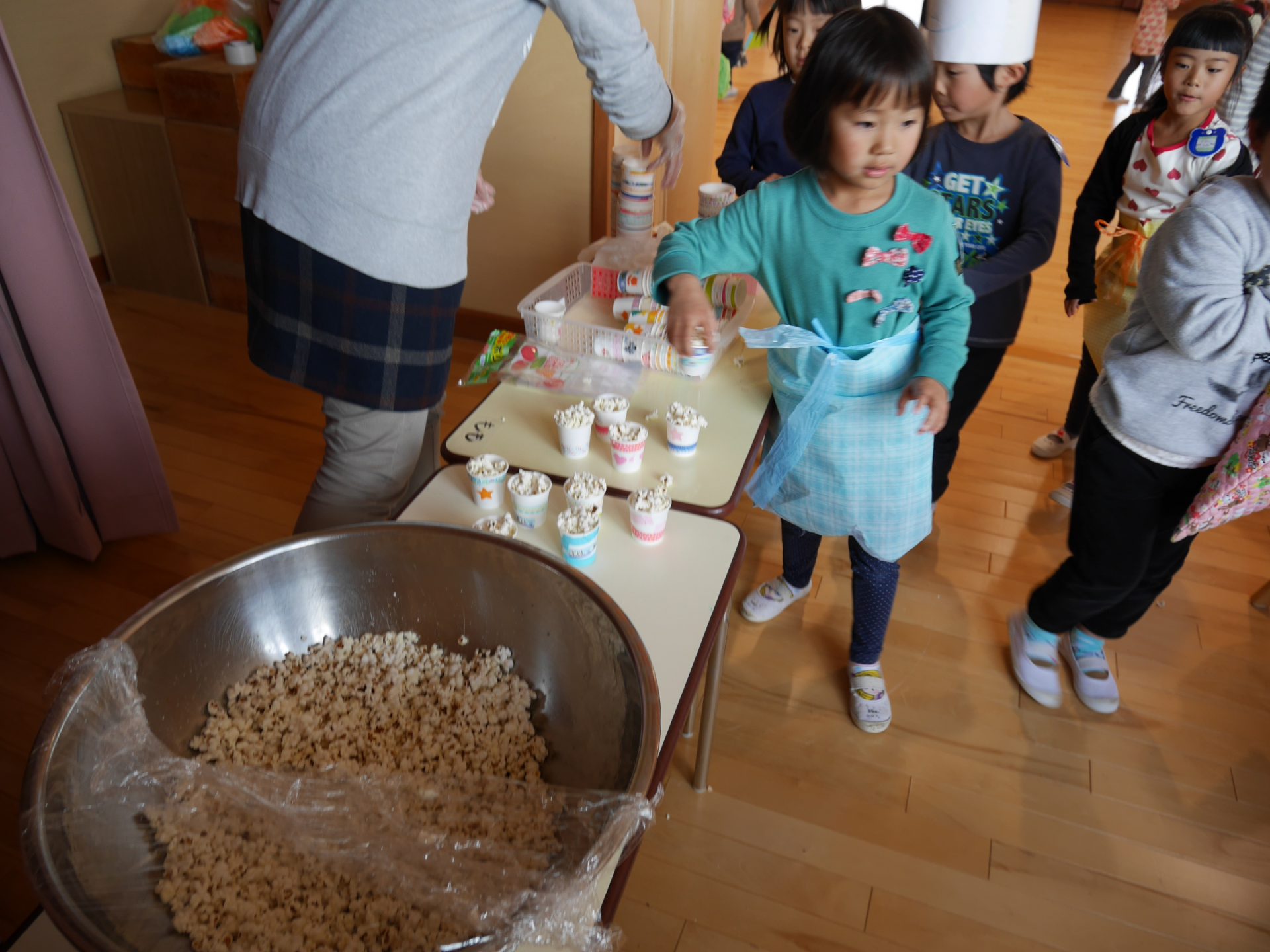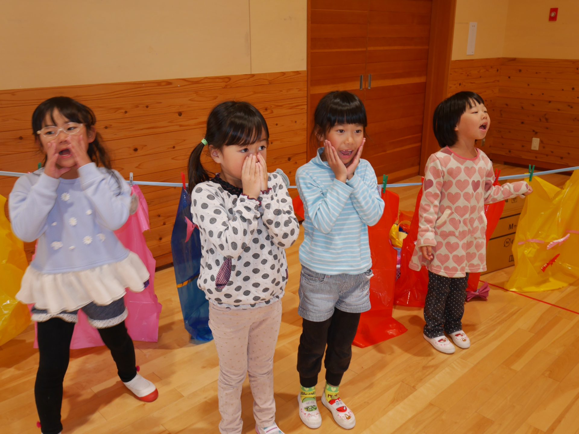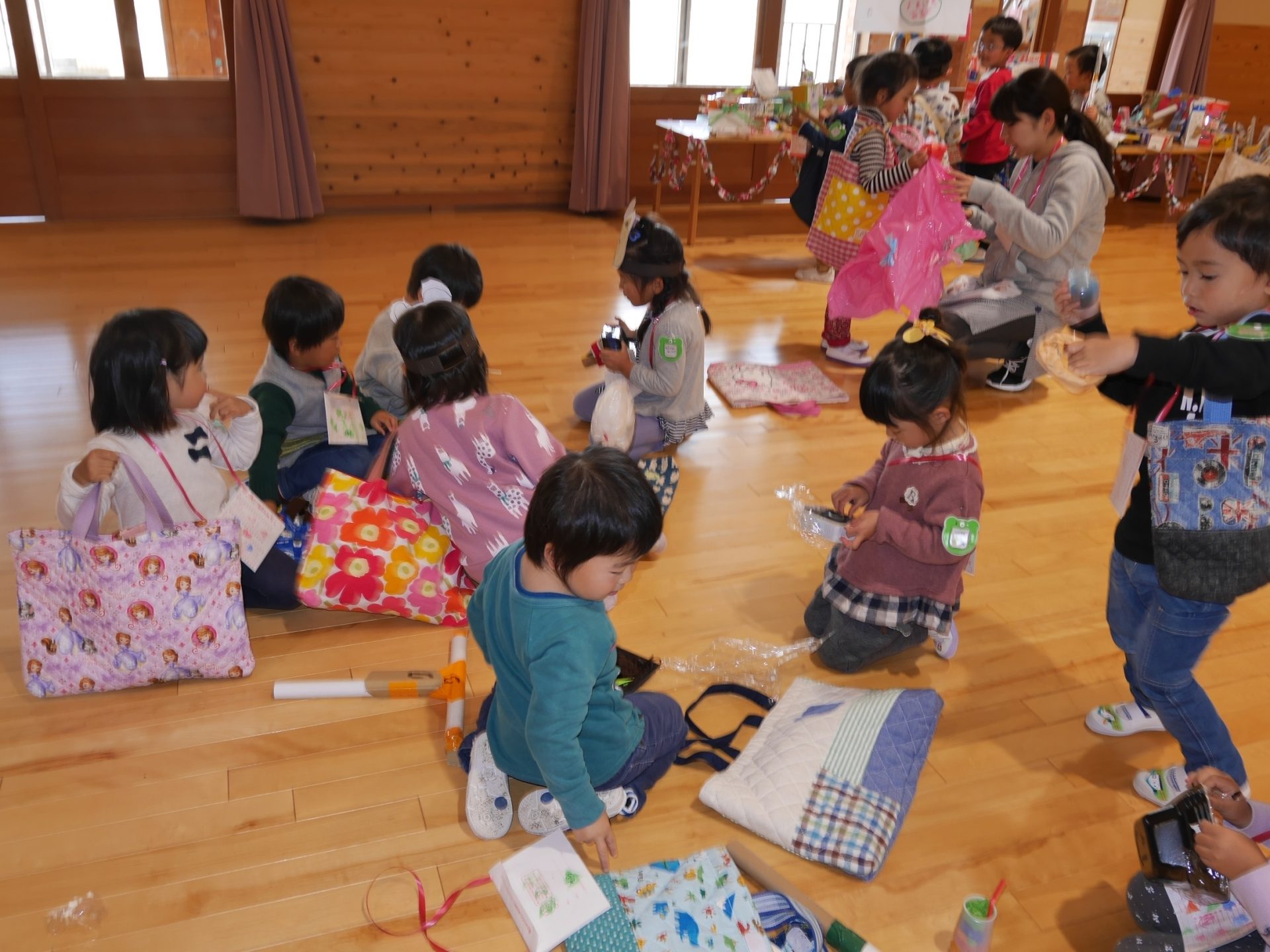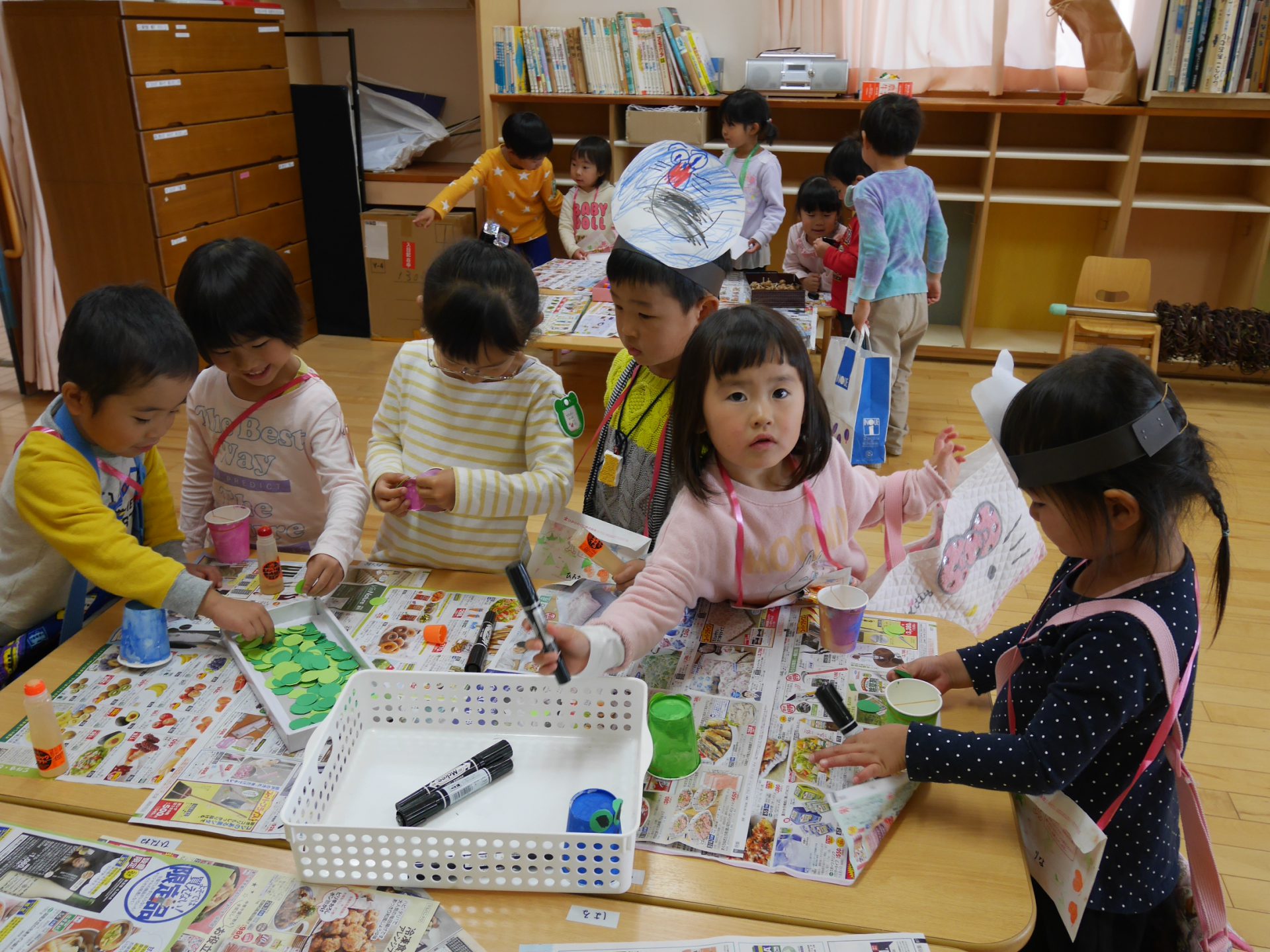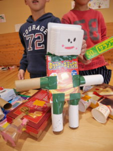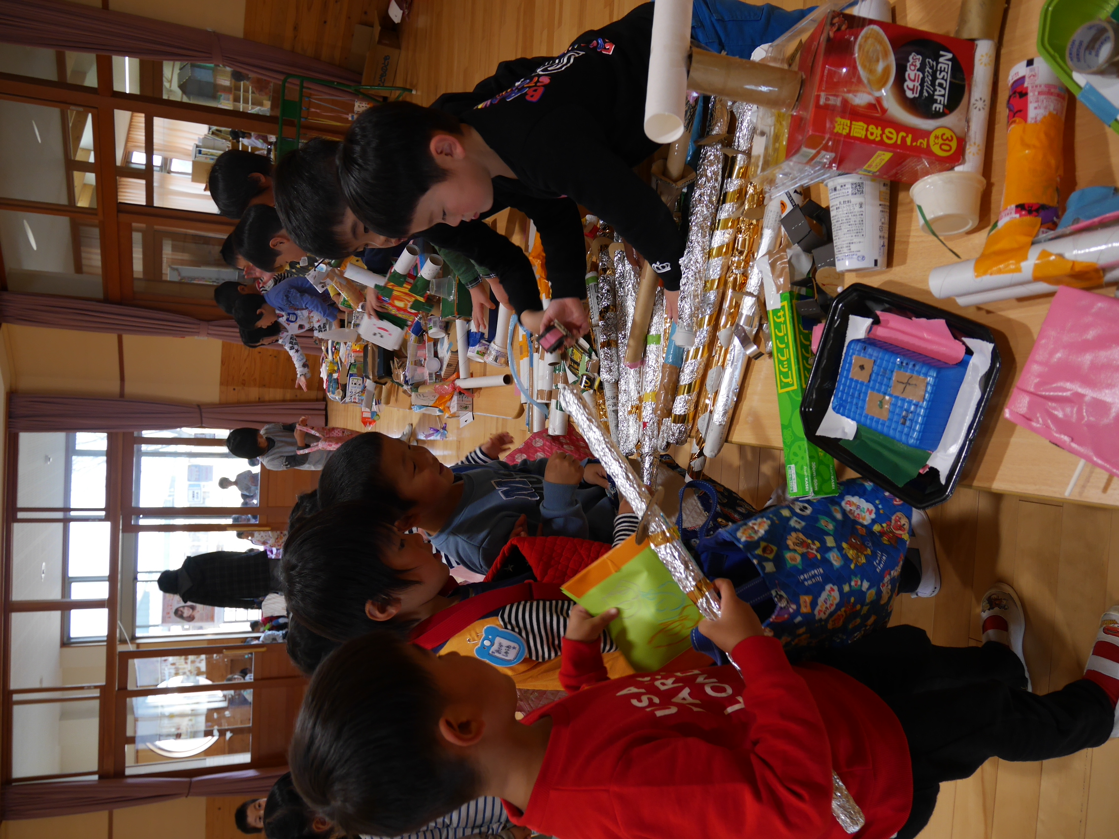 開店の時、小さい子が困らないように教えてあげる。「自分で出来るように」教えてあげる。今までの経験の中で3クラスが集まって作ってきたことを積み重ねていくうちにお店屋さんで必要な「もの」や「こと」がたくさん出て形になりました。年中さんが「年長さんてやっぱりすごいね!」と友達と会話をしていました。