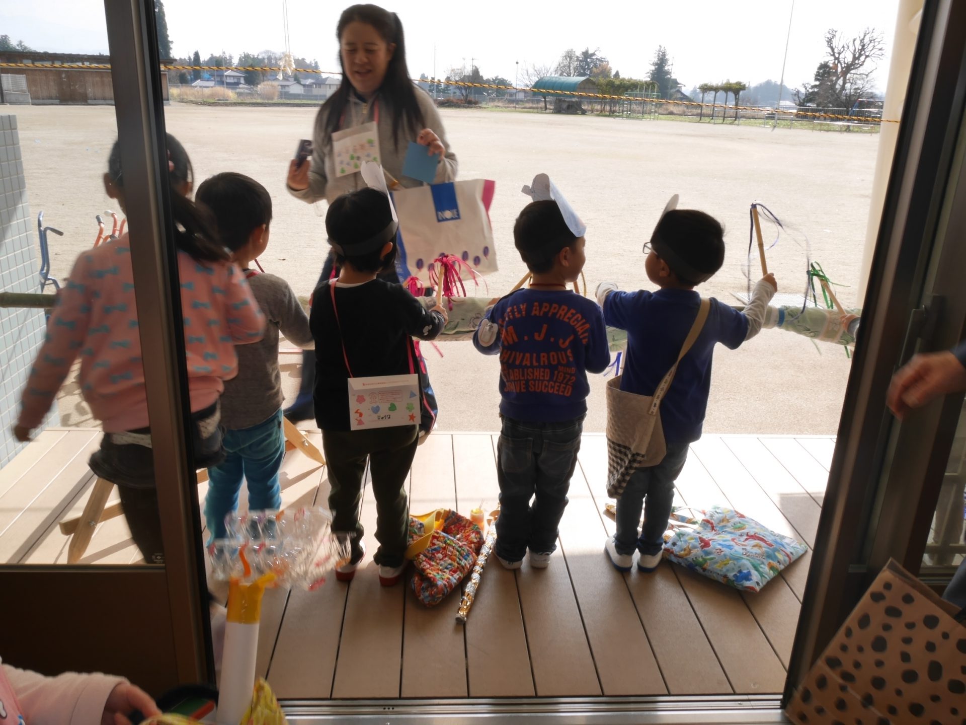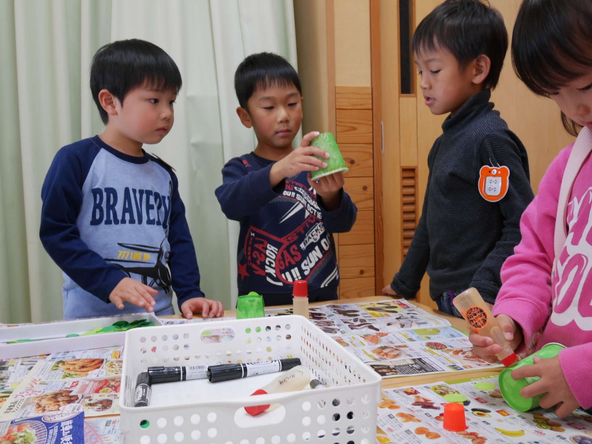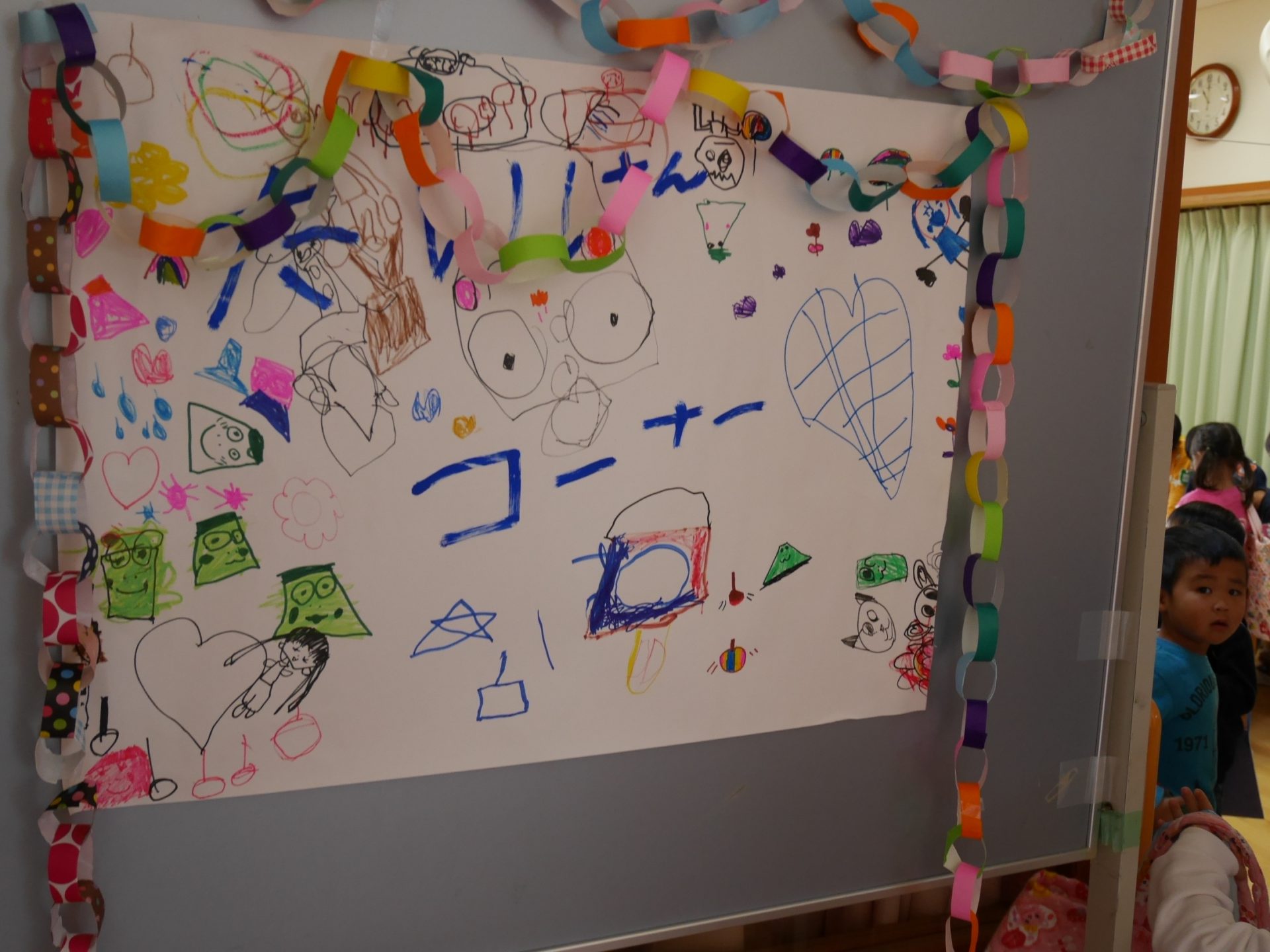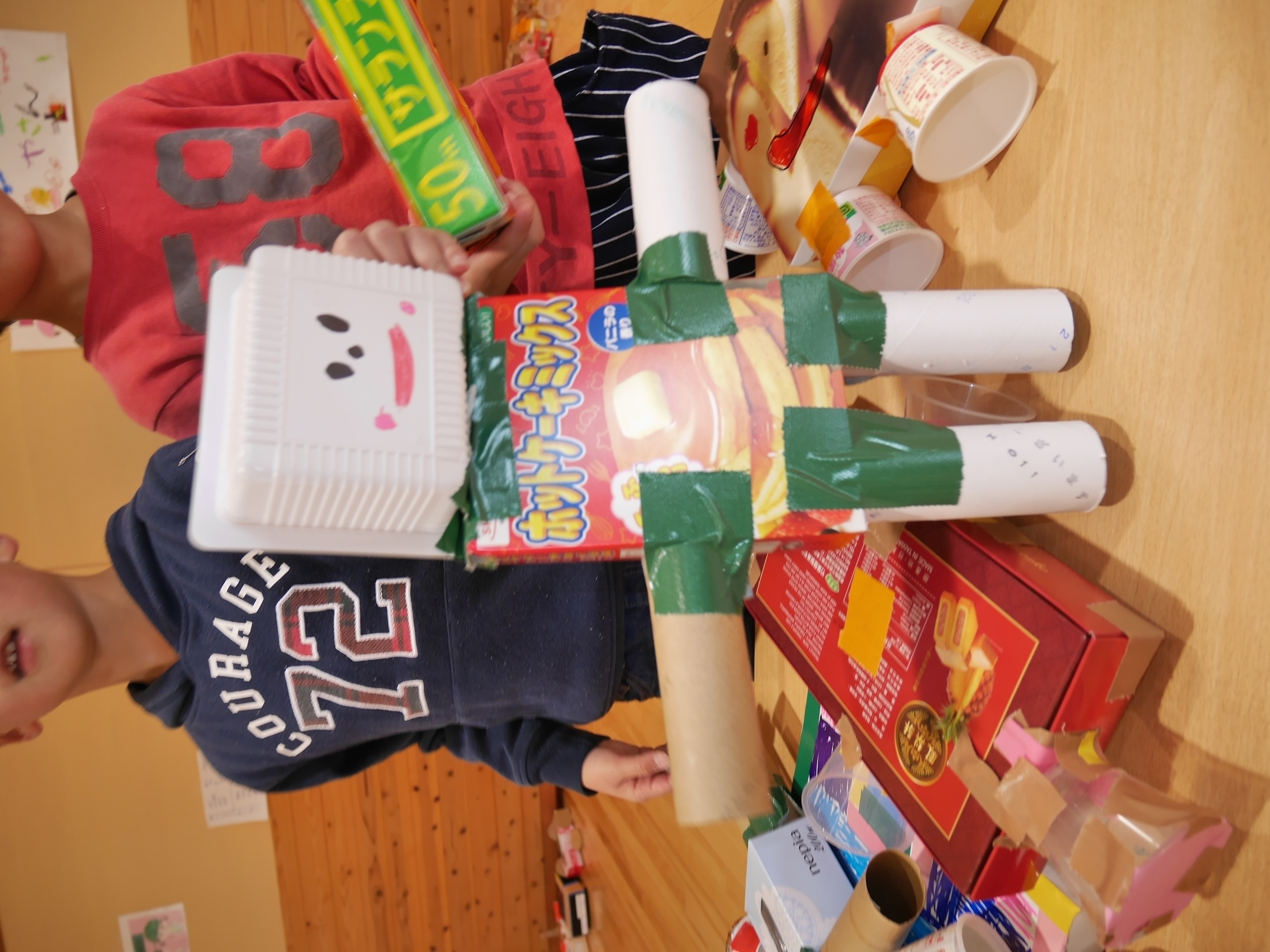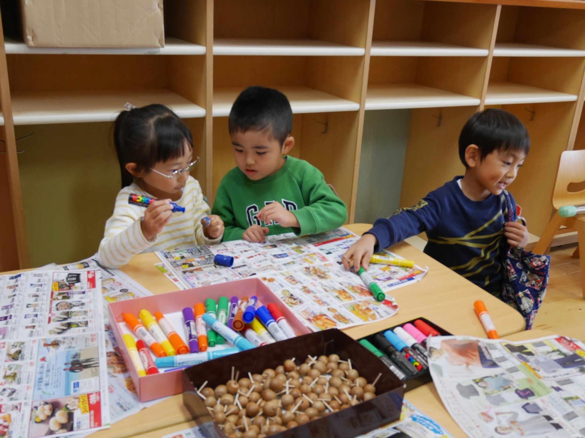 開店の時、小さい子が困らないように教えてあげる。「自分で出来るように」教えてあげる。今までの経験の中で3クラスが集まって作ってきたことを積み重ねていくうちにお店屋さんで必要な「もの」や「こと」がたくさん出て形になりました。年中さんが「年長さんてやっぱりすごいね!」と友達と会話をしていました。