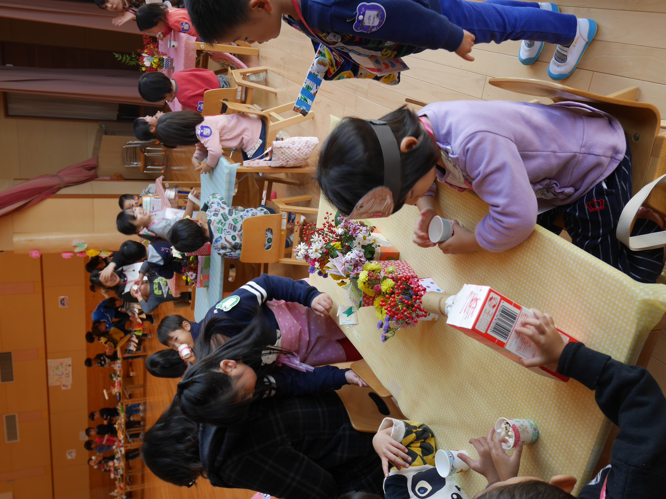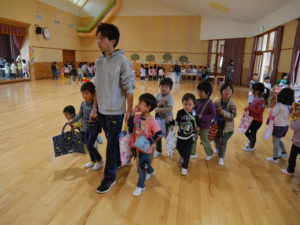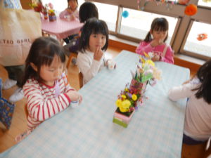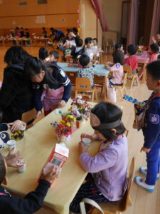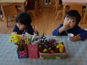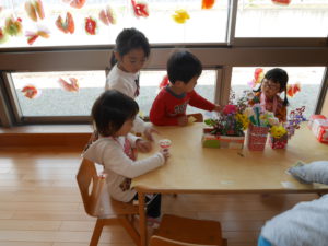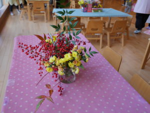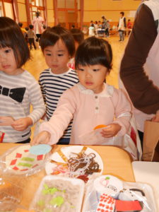 運動会が終わって、友達、異年齢児の事をたくさん考えられるようになった年長児。グループや全体での活動も話し合い考え、作る経験をたくさんして本時の活動になりました。散歩で拾ったどんぐりや枝での制作、自分たちで育てたポップコーンのレストラン。運動会のリズムの一部を体験させてあげるコーナー。祖父母参観で生け花の経験を思い出し、皆で花を持ち寄り飾ったこと。数々の工夫が随所に見られ、当日は困らないように、楽しめるようにとみんなで決めたお店。小さいクラスの子どもたちは保育士や友達と一緒に感動し、楽しむことができ、それぞれの目的が達成できました。
