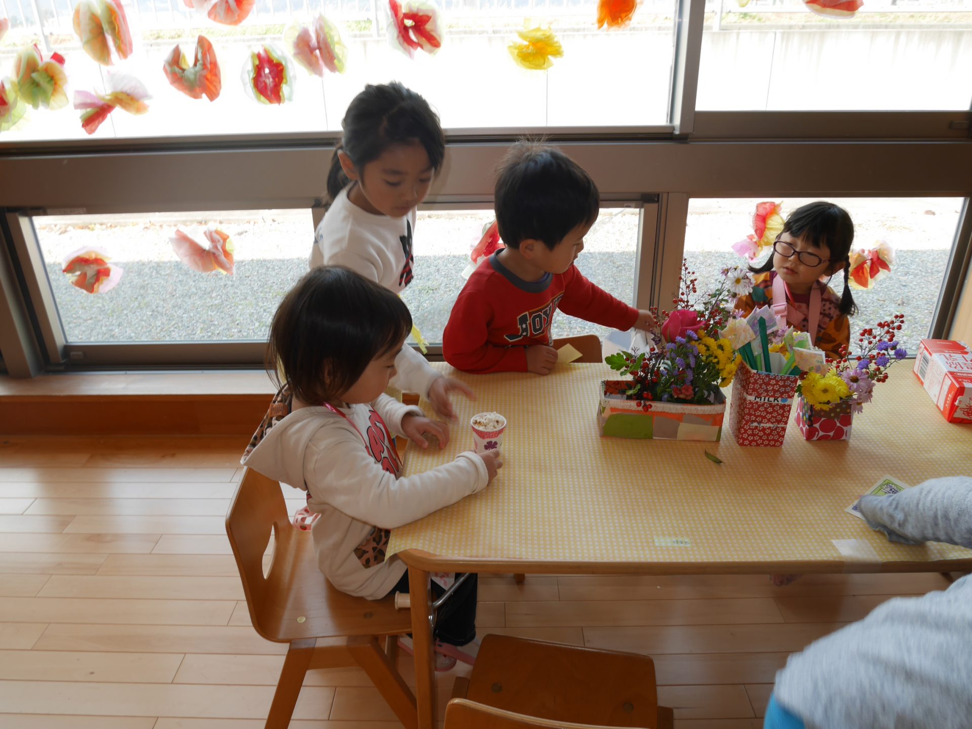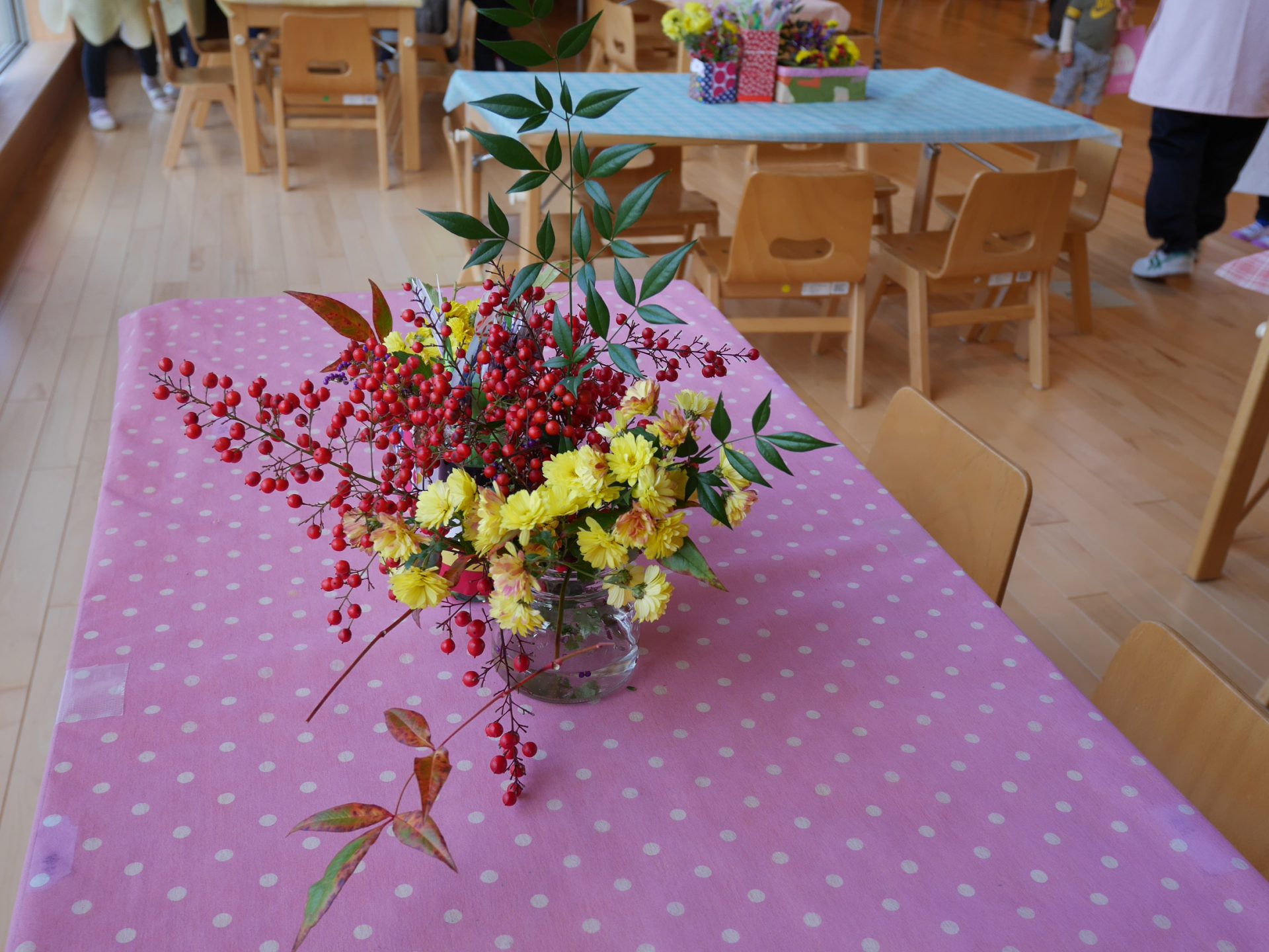 この日の為に生花を飾っておもてなし。「全部私たちが活けたよ。」