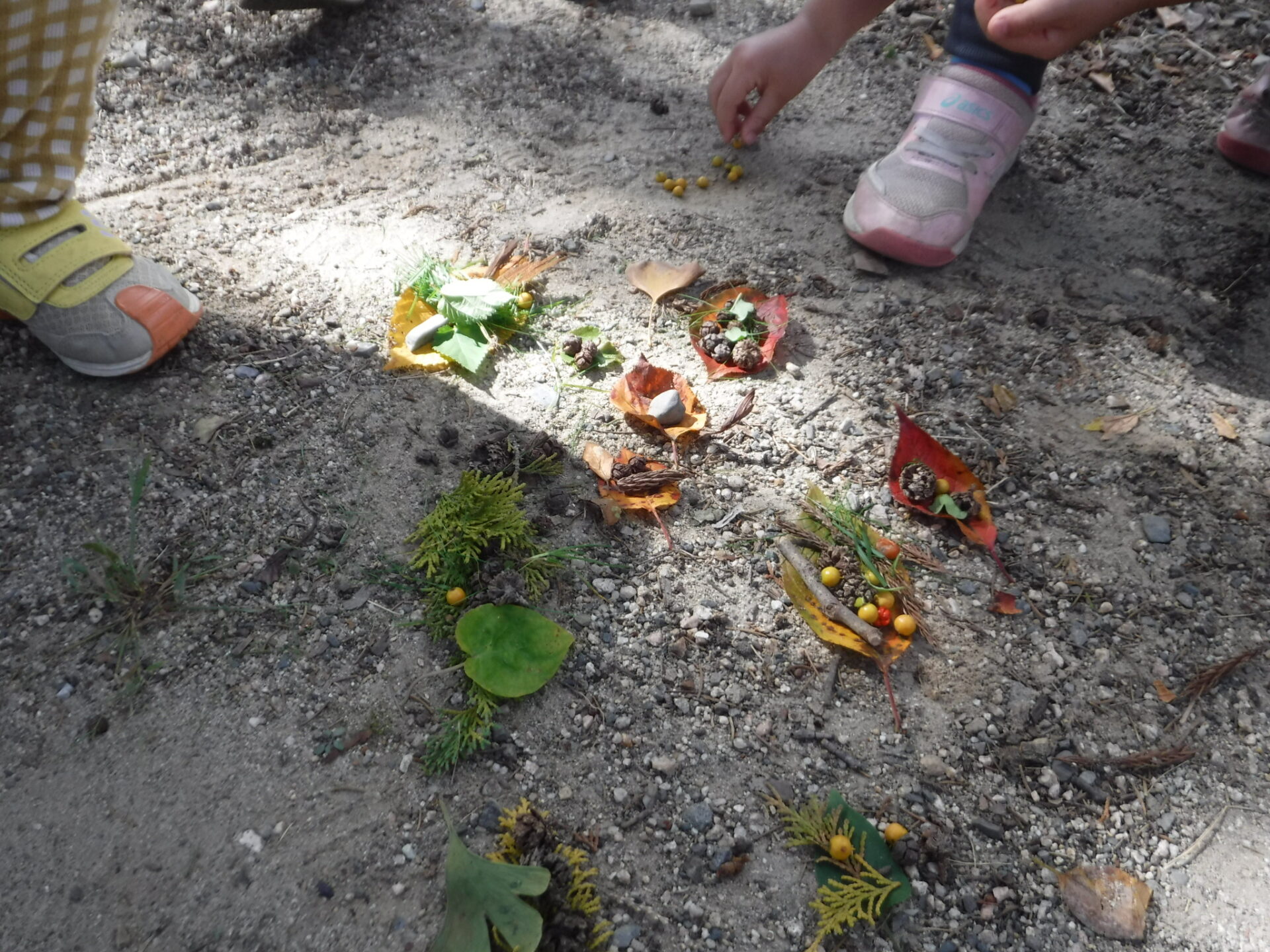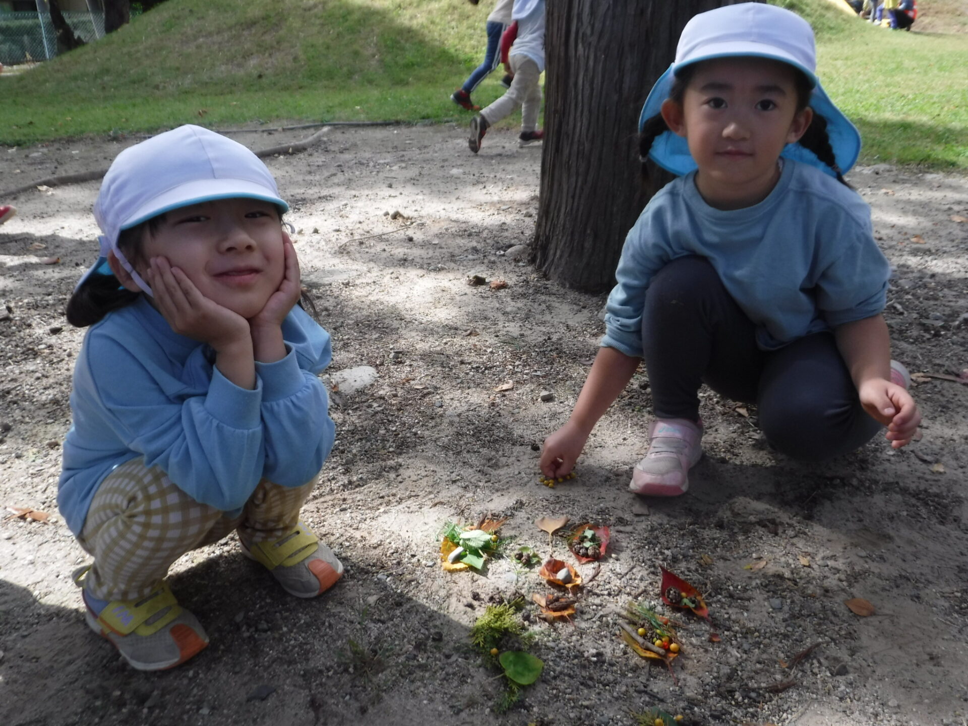 色とりどりの秋の自然に触れ、友だちとイメージを共有しながら楽しそうに遊んでいました。