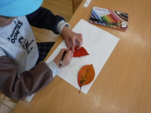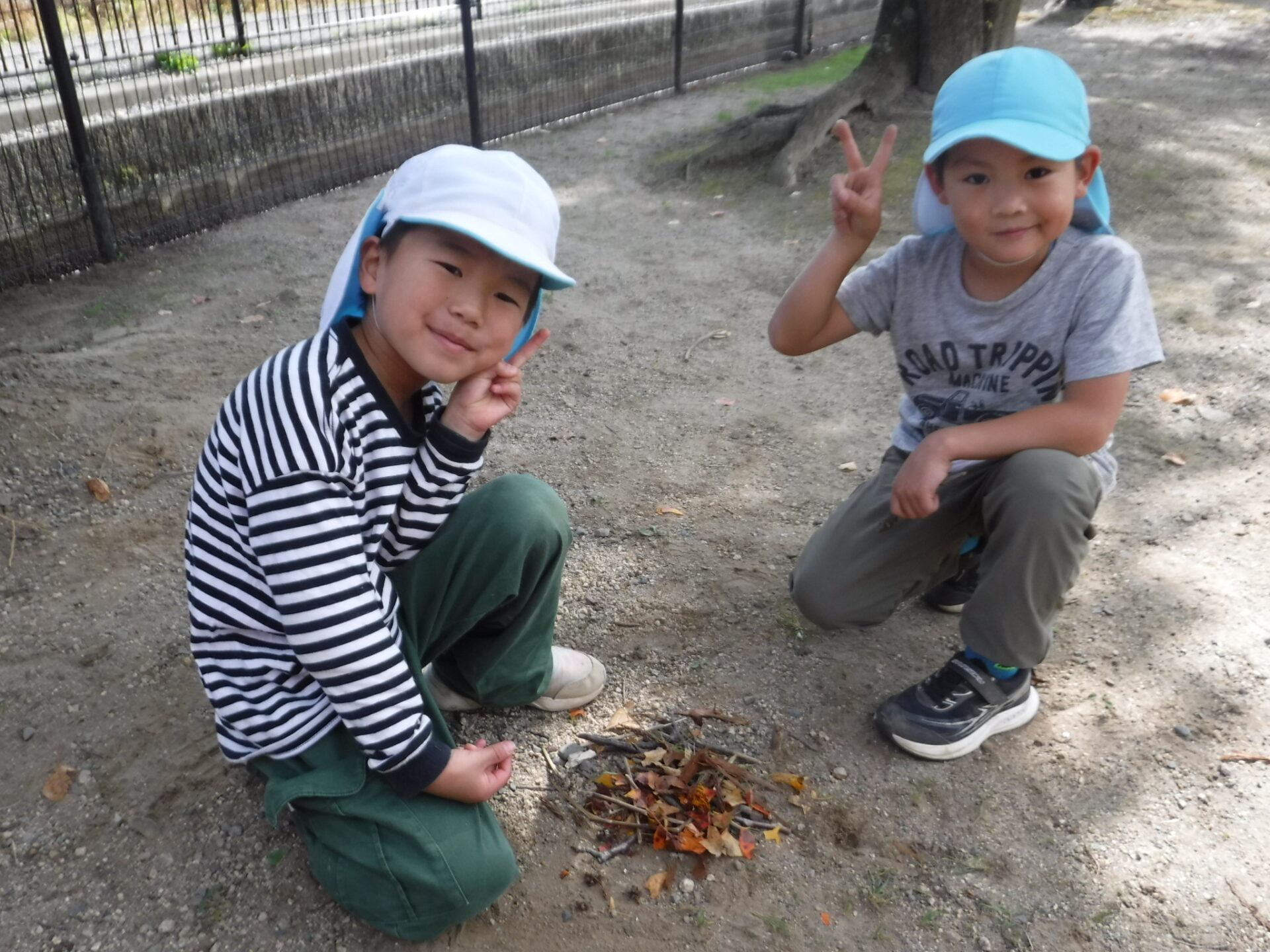 夏は青々と繁っていた木々の葉っぱが色づき、落ちている様子に大喜びの子どもたち。