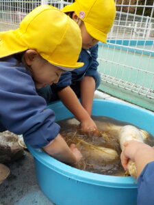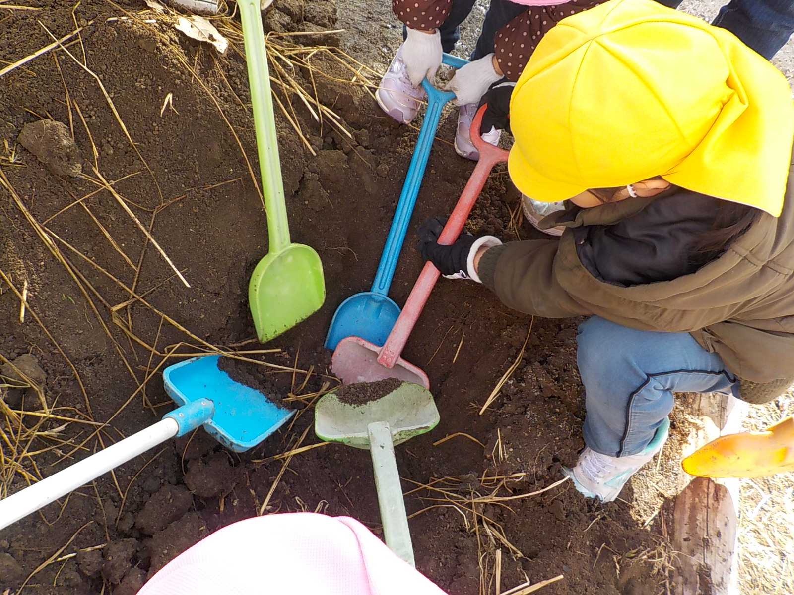 みんなで保育園の大根と地区の長谷川さんに頂いた大根を、埋めてあった土の中から宝探しのように掘り起こしました。