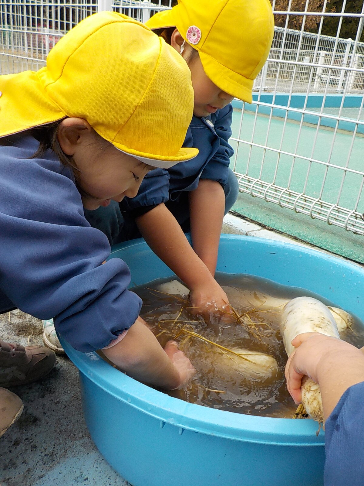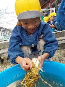 無事掘り出すことができ、年長さんが土の付いた大根をお湯の中に入れて藁のたわしでゴシゴシ!と洗います。