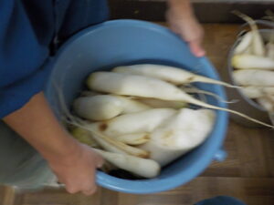 ・土で真っ黒だったけど、藁のたわしでこすったら真っ白い大根になった。
