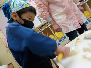 皮をむいたりや包丁で切っていくのは年長さん。きれいに洗った大根の皮をピーラーでむいていきます。手をむかないよう気を付けて!