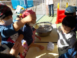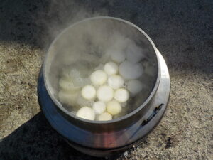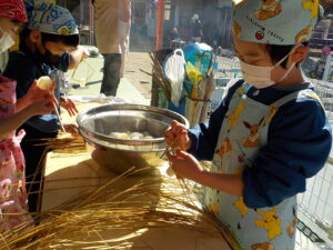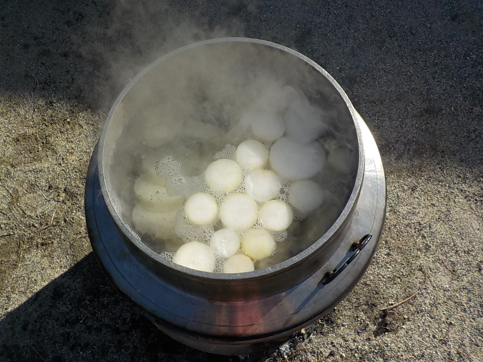 園庭で火を焚き、かまどのお湯でグツグツと茹でていきます。