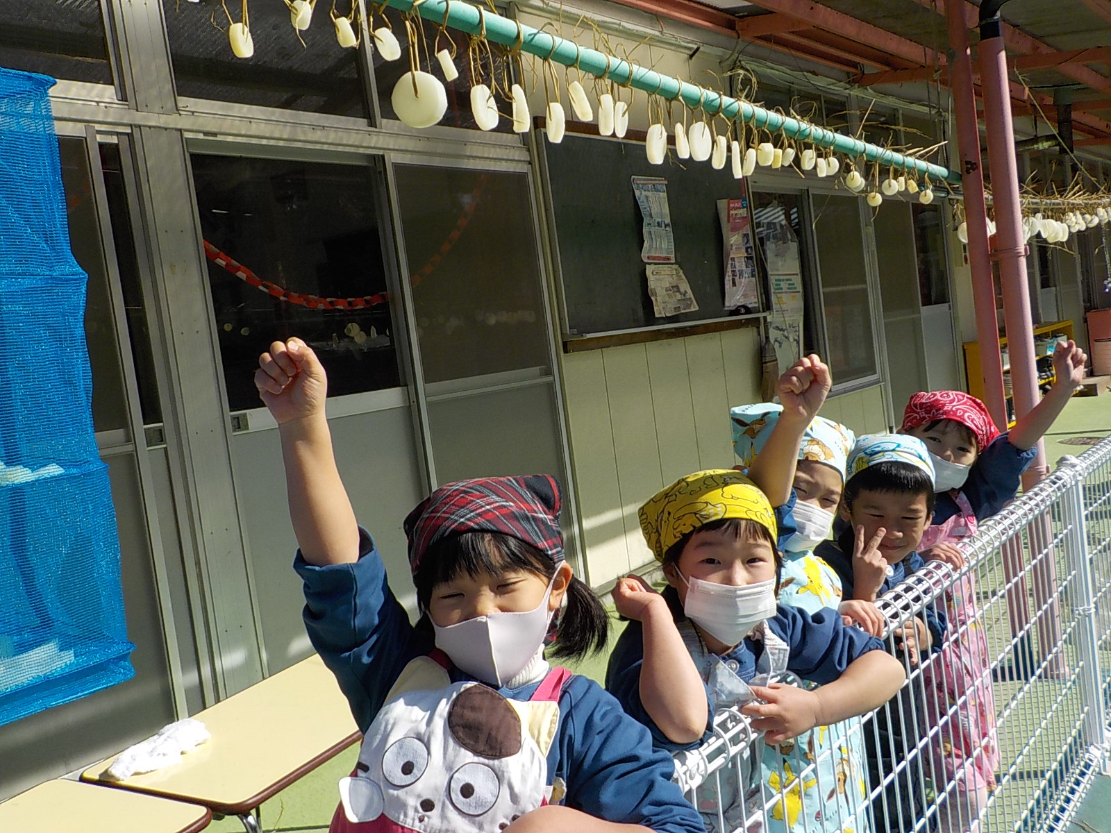・これから、つるした大根が凍ったり溶けたりを繰り返し段々と乾いて小さくなっていく様子を子ども達と見守り、出来上がったら凍み大根の煮物にして食べたいと思います。