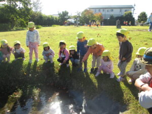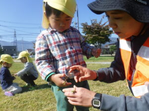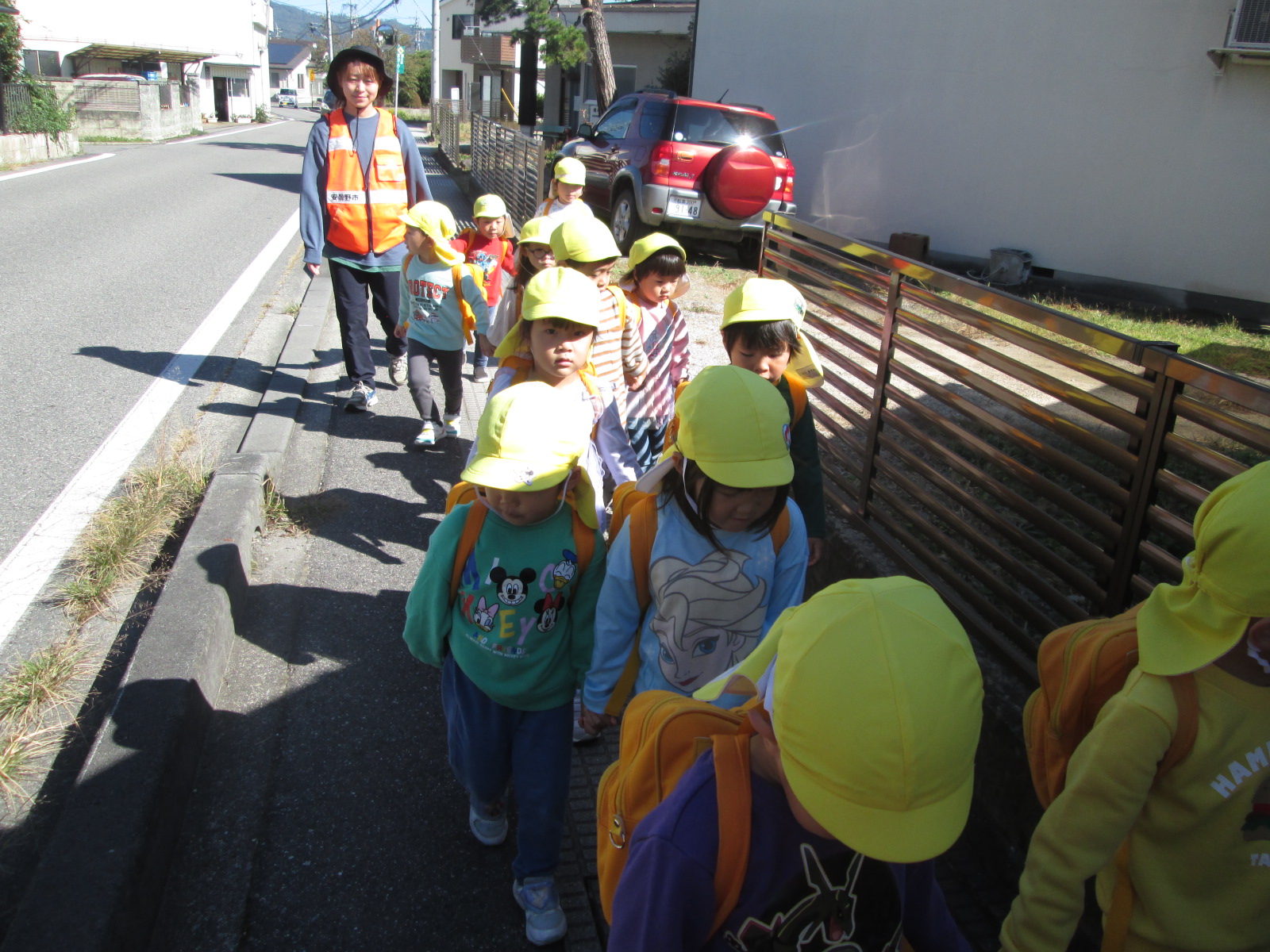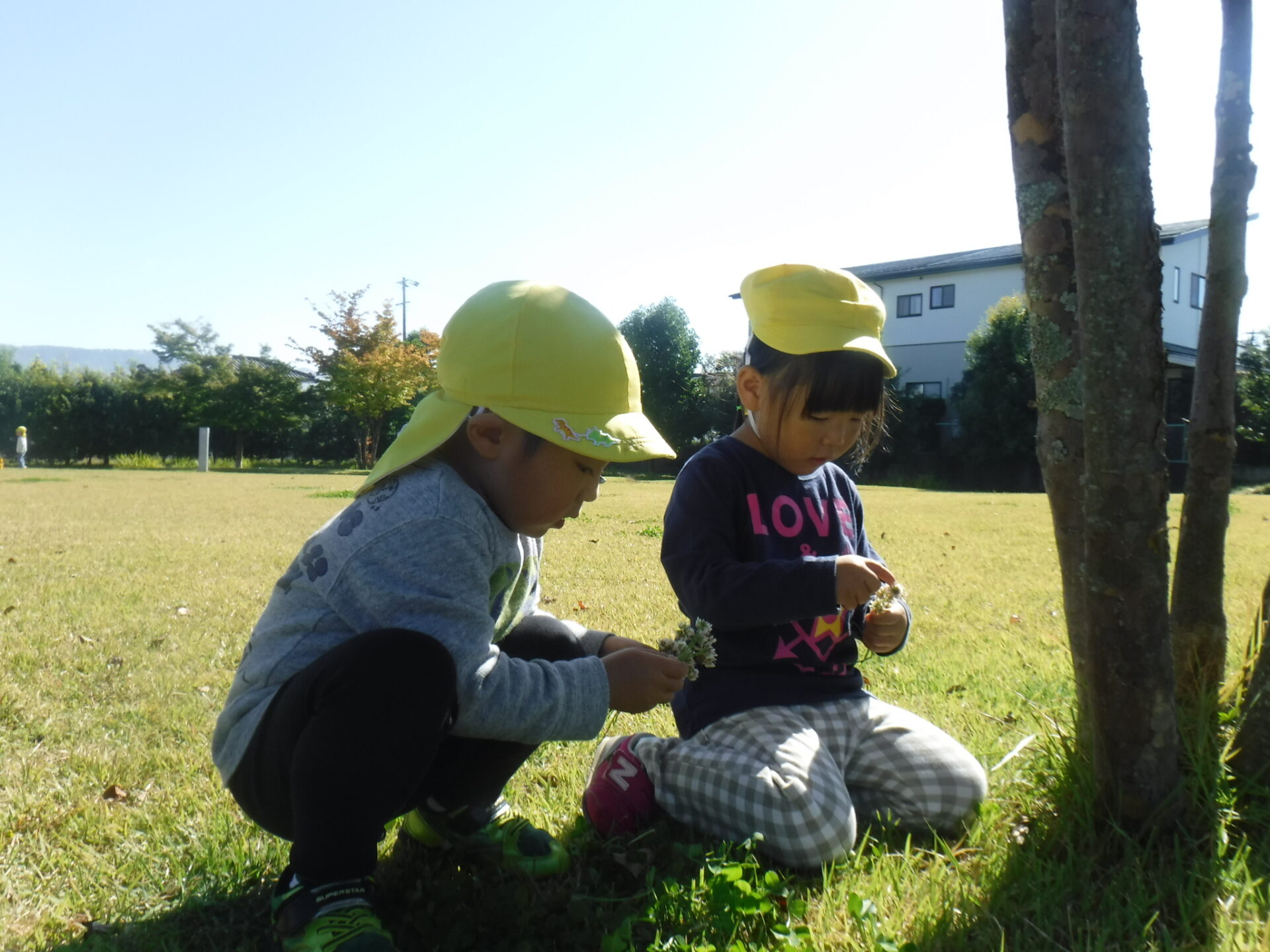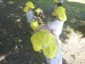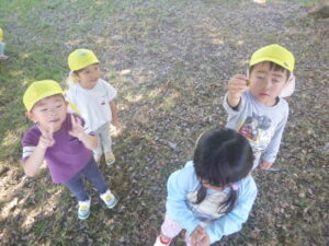散歩に出掛けると、子ども達の目がキラキラしています。園の外にも秋の自然がたくさんあふれていて子ども達もそれに触れて楽しんで欲しいと願っています。子ども達の素直な目線やつぶやき発見を大切にしていきながら、これからも楽しい散歩の時間を作っていきたいと思います。