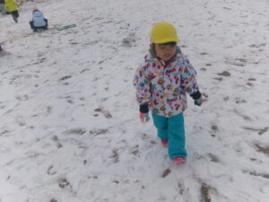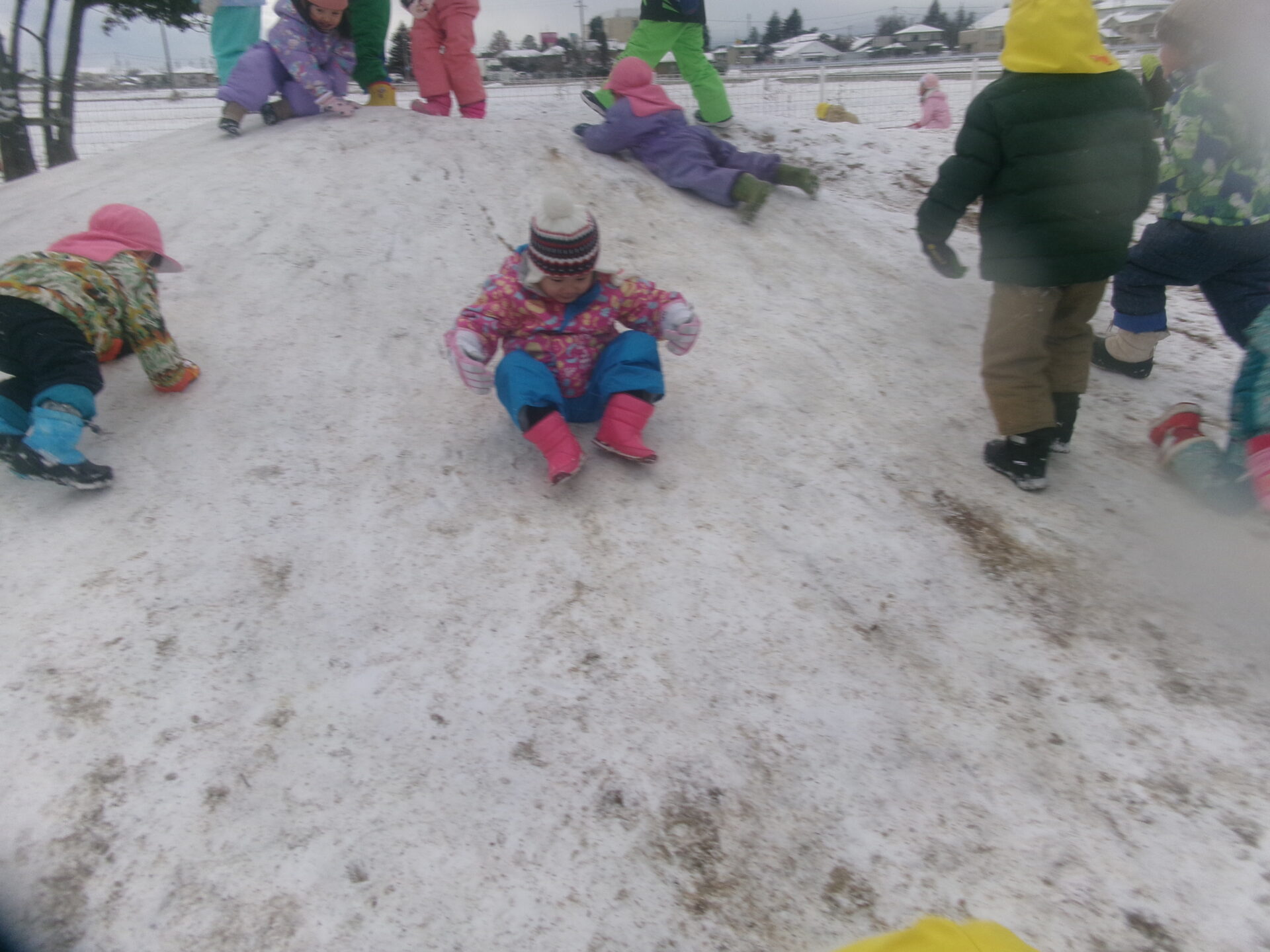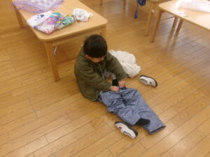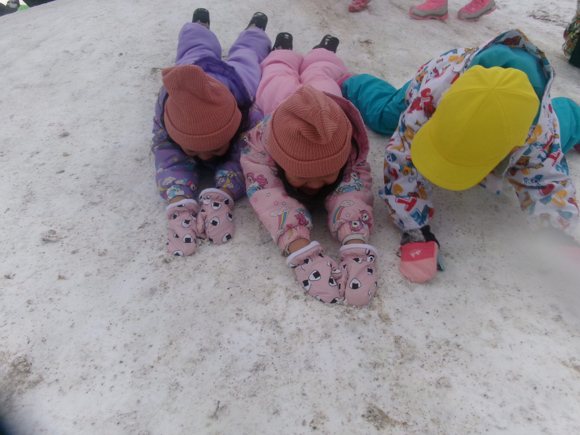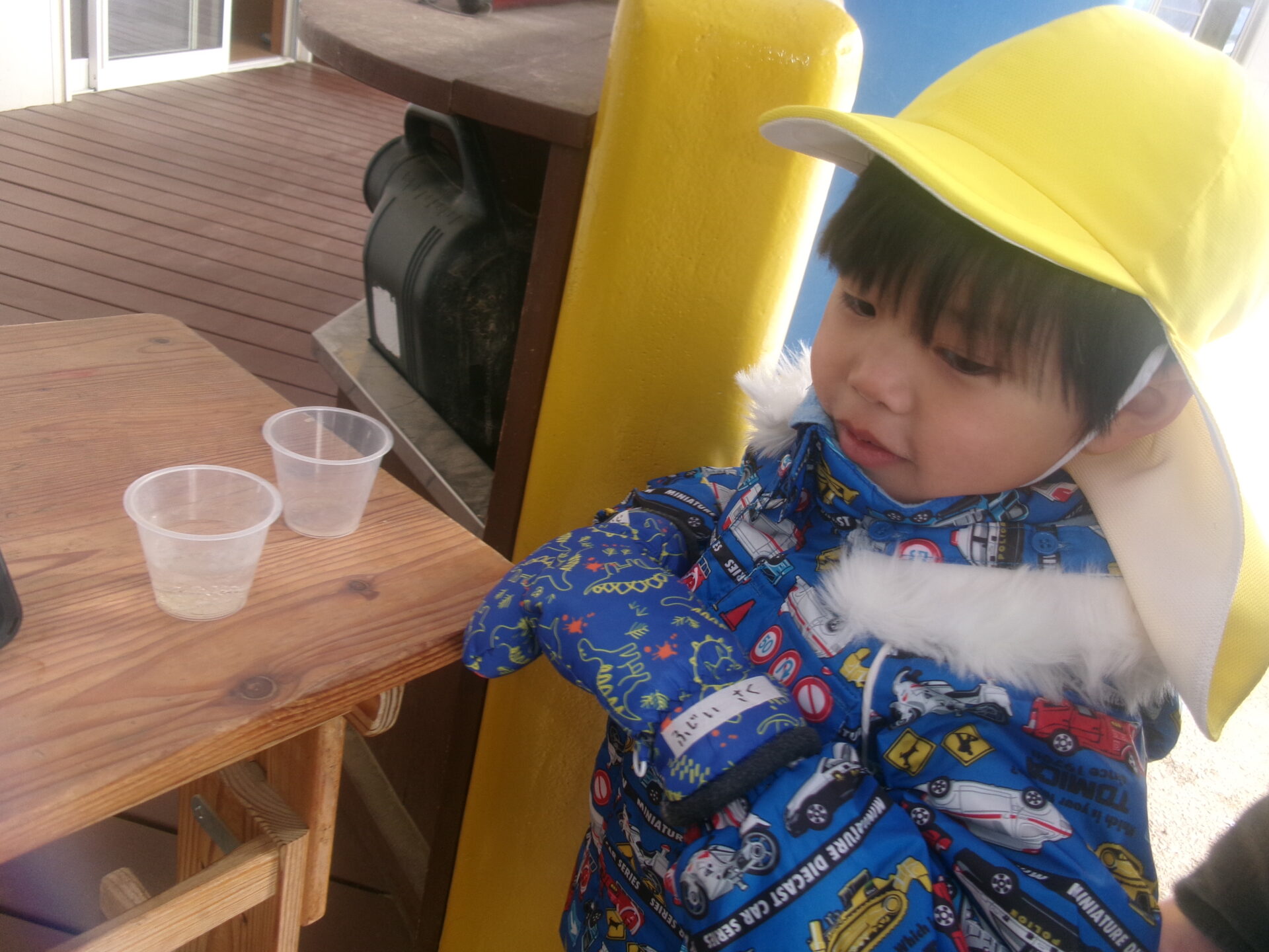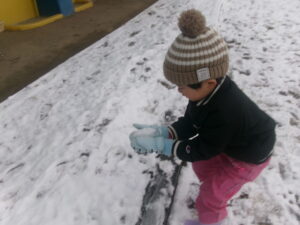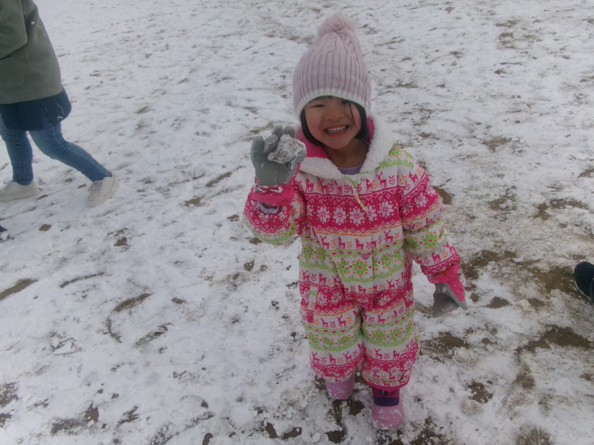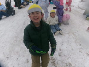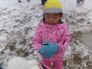 実際に雪や氷に触れて「冷たい」「サラサラ」「きゅってなる」「カチコチ」「つるつる」と感じること、息を吐くと「白いね」「寒いね」と感じること、身体全部を使って「冬」を体験できることに感謝し、大切にしていきたいと思います。