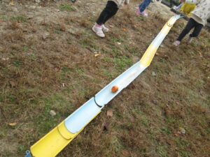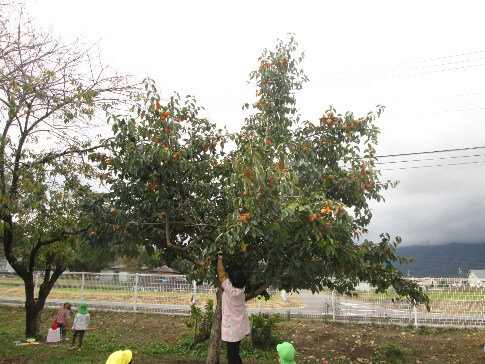 秋になり、いよいよ柿の収穫(渋柿)時期。保育士の動きを見ている子どもたちは集めた柿をどうするのかとっ興味津々です。