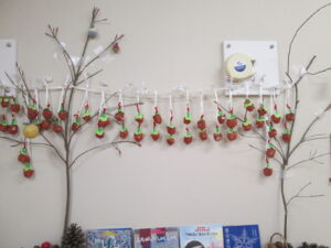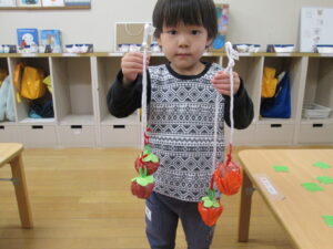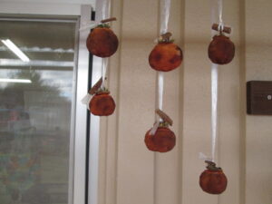 季節の変化と共に柿の木の変化にも気づいた子ども達は、柿を食べに来るカラスにも関心を持っていました。そんな日々を過ごしながら柿の葉や実を実際に触れながら遊んだり干し柿作りや制作をする体験ができました。