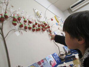 絵本を見て干し柿作りに興味をもち、やってみたくなった子ども達。