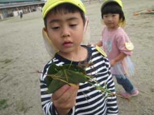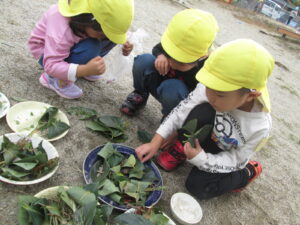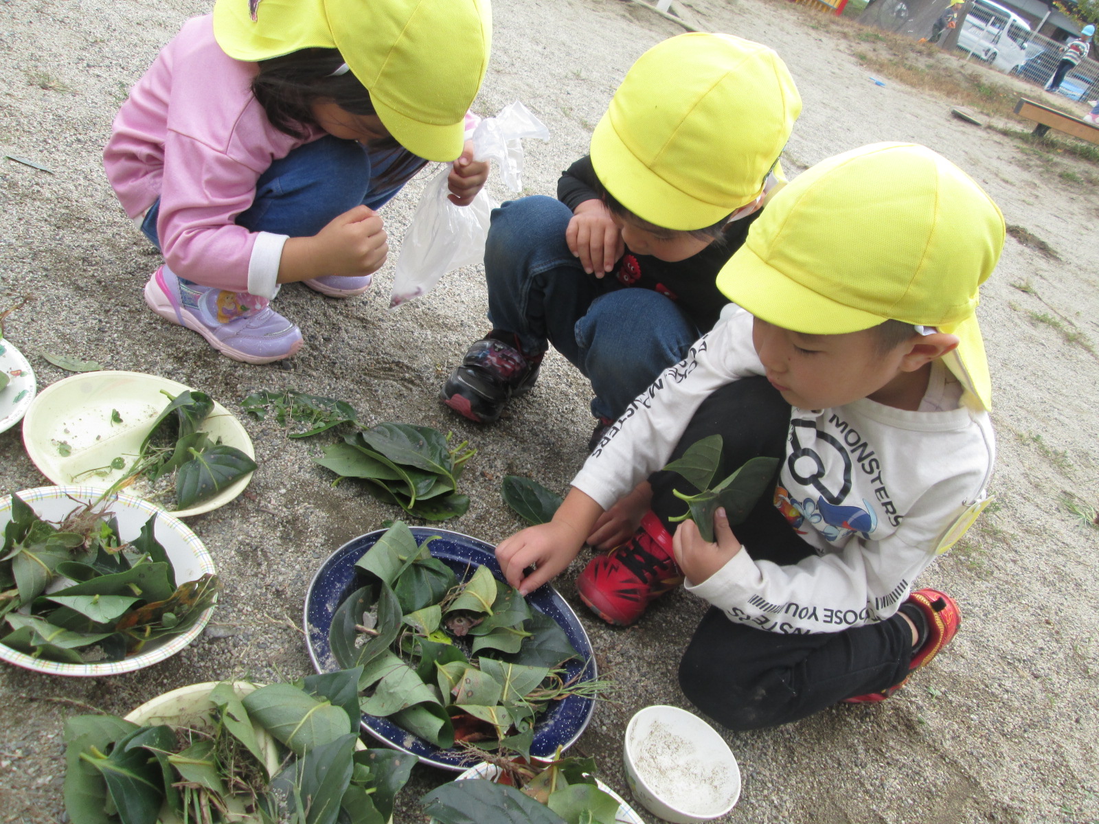 「葉っぱに石を入れて “柿の葉もち” つくったよ」