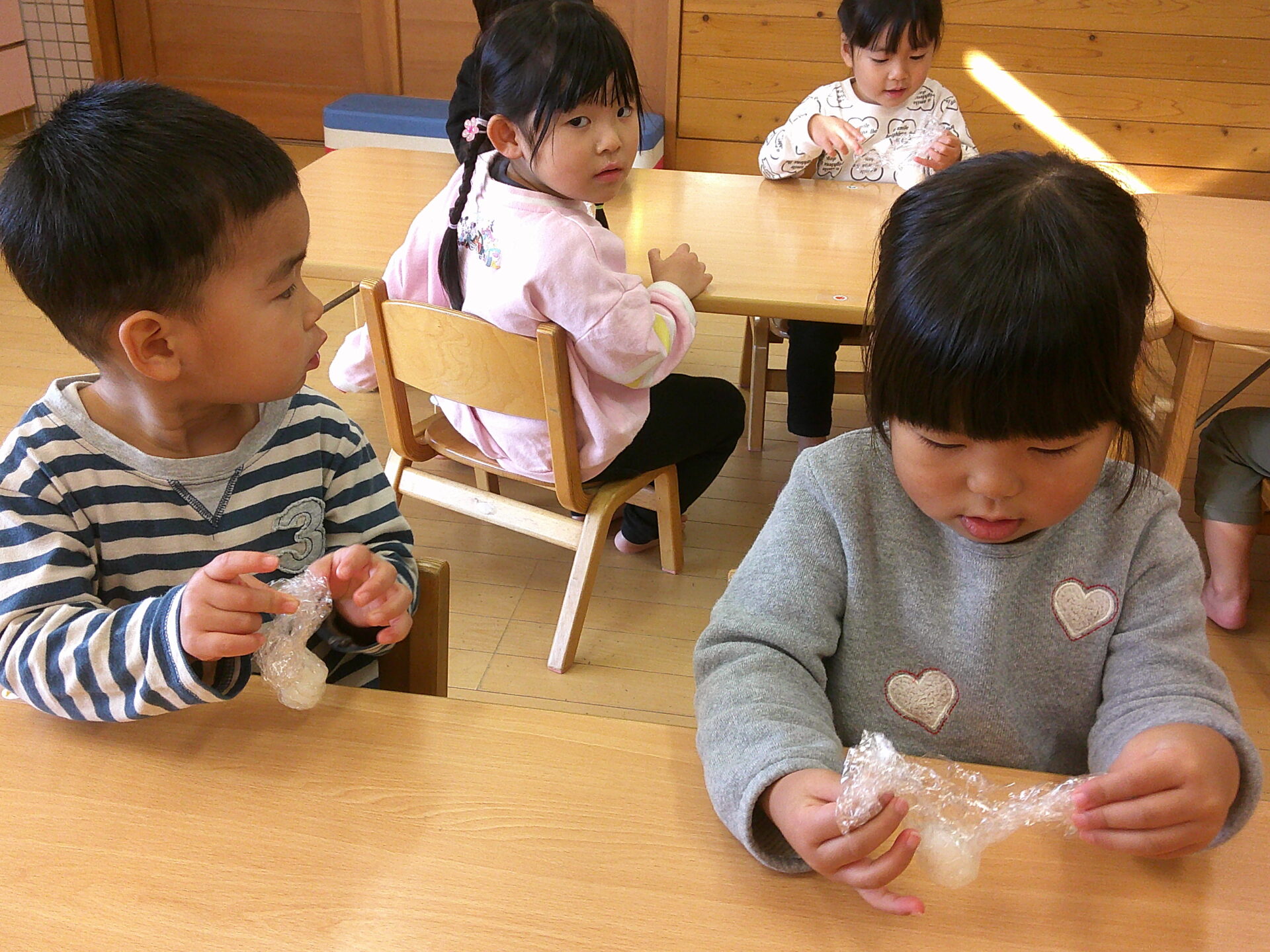 ラップを敷いてご飯を包んでにぎります。「うまくできたよ〜」「おいしそ〜う」