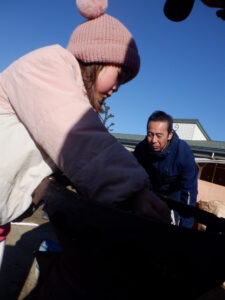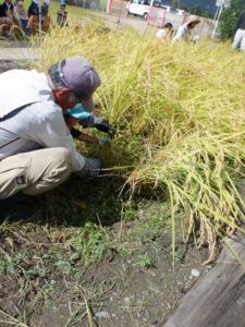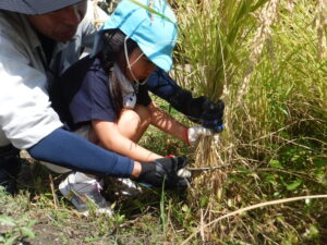 稲刈り・・・「刈るときの手はこう・・・。」指を一緒に切らないように教わりました。