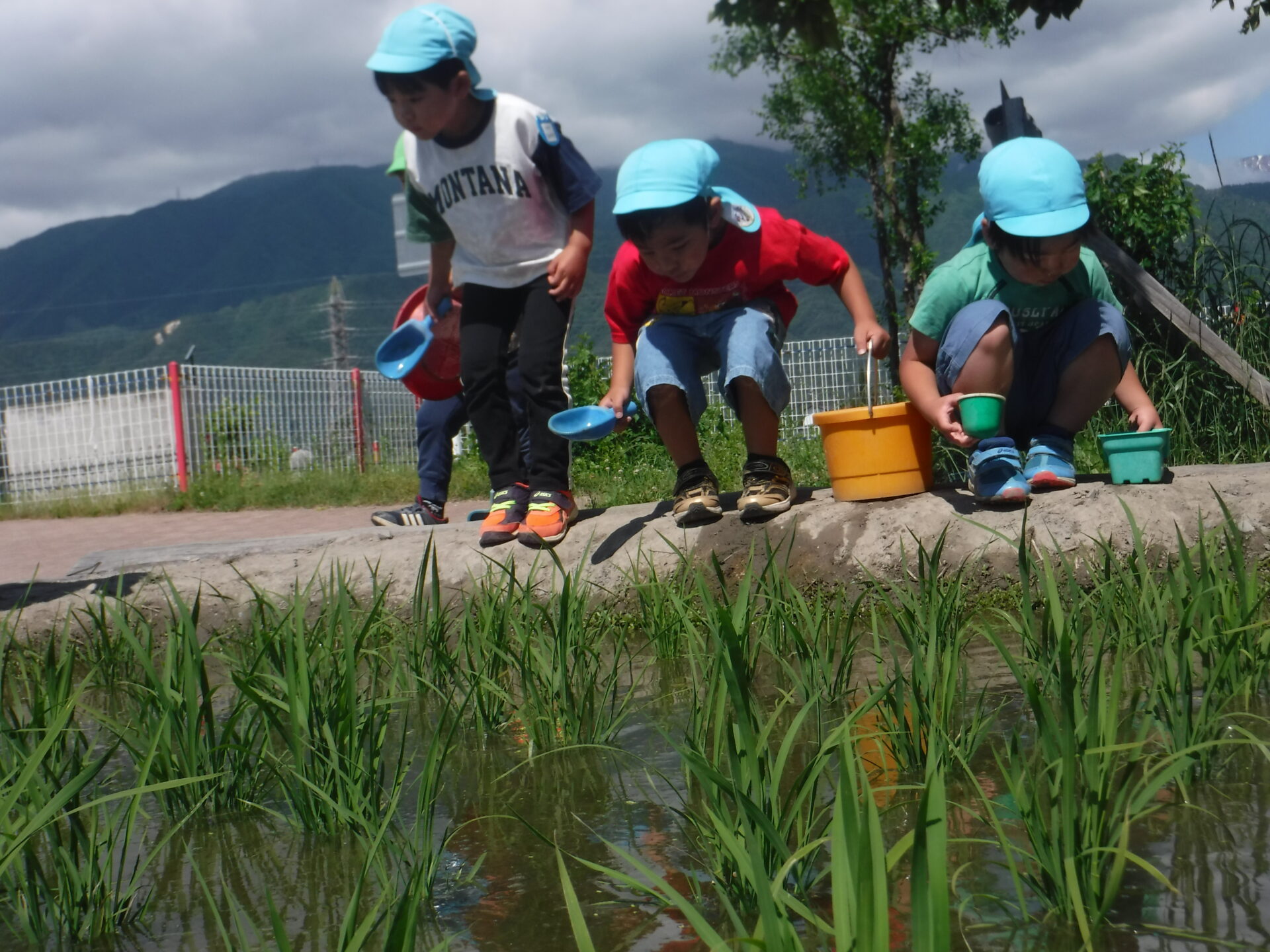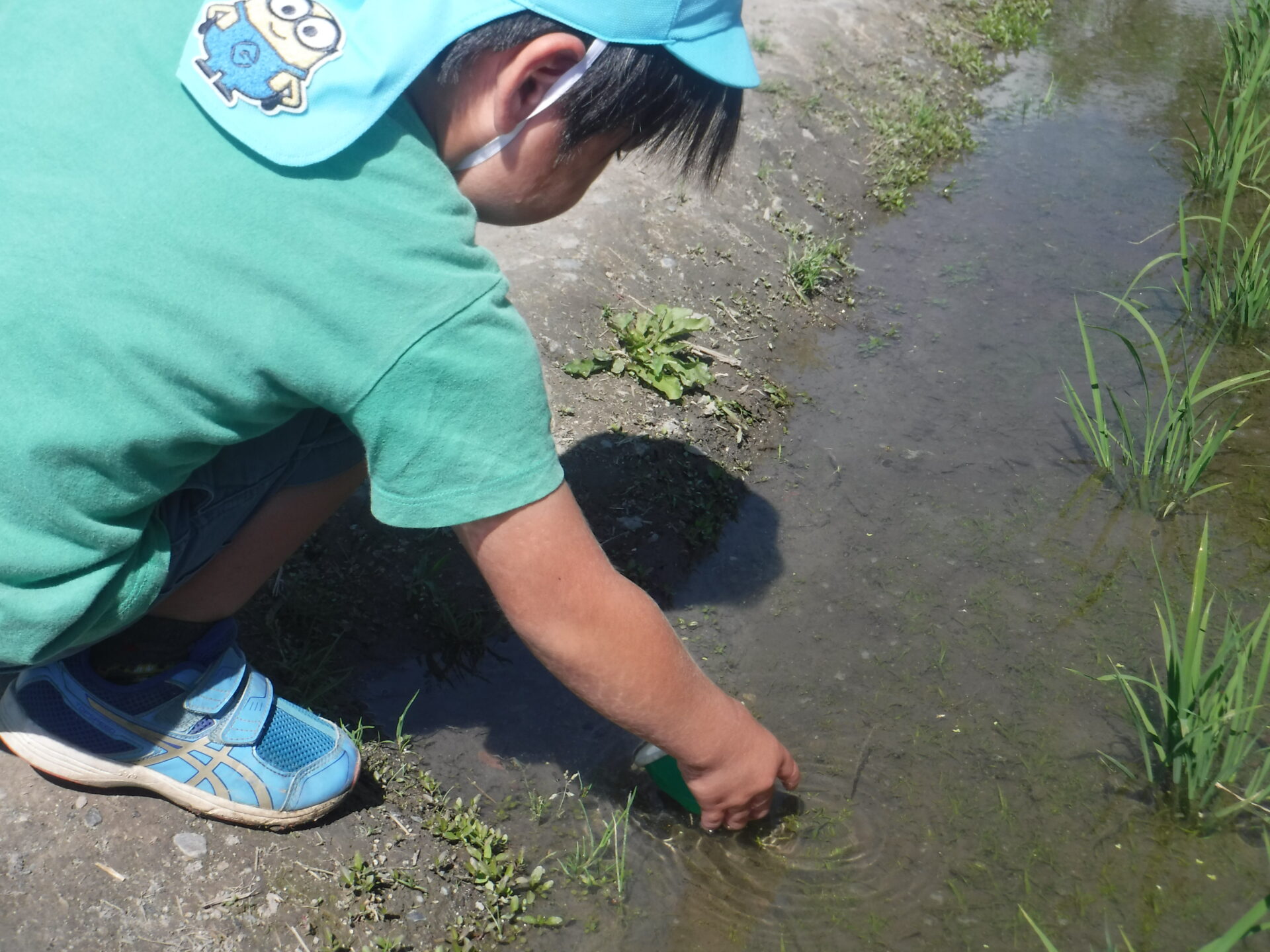 田んぼのまわりで遊び、虫を探しに田んぼをのぞき「大きくなったね」「色が変わった」とお米の生長を楽しんでいた子どもたち。