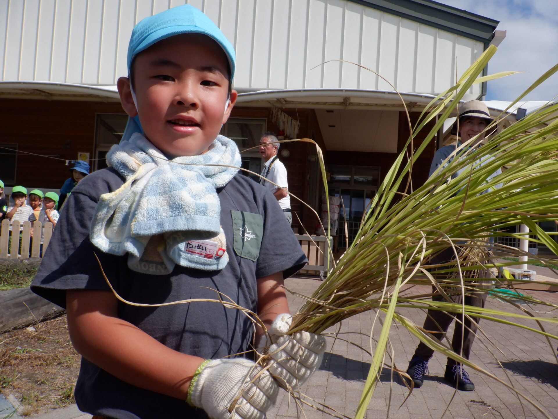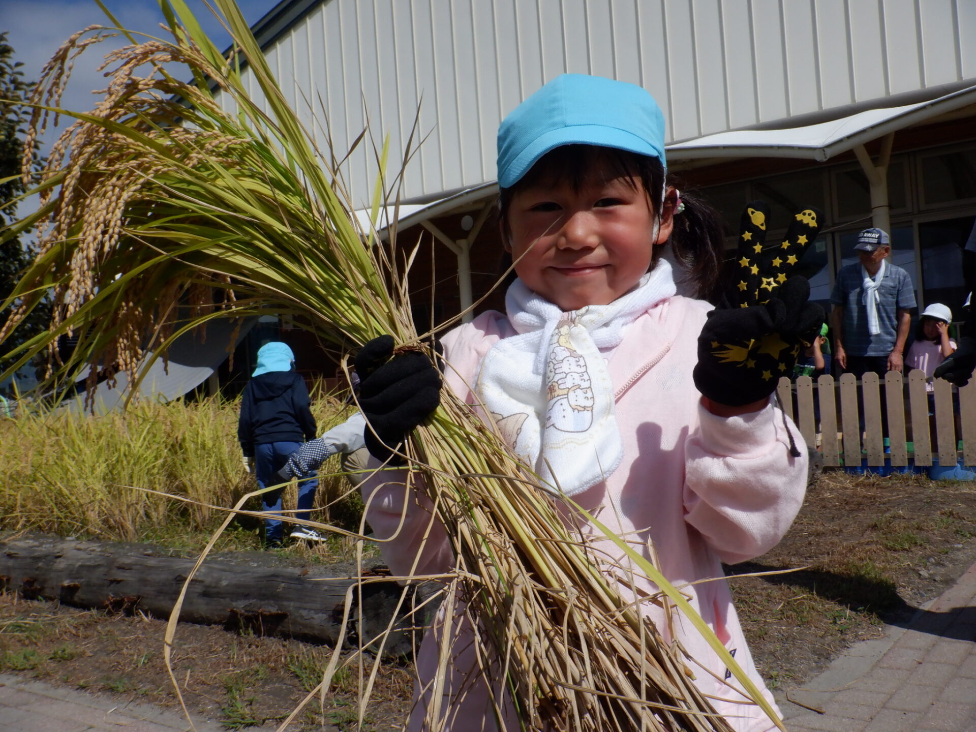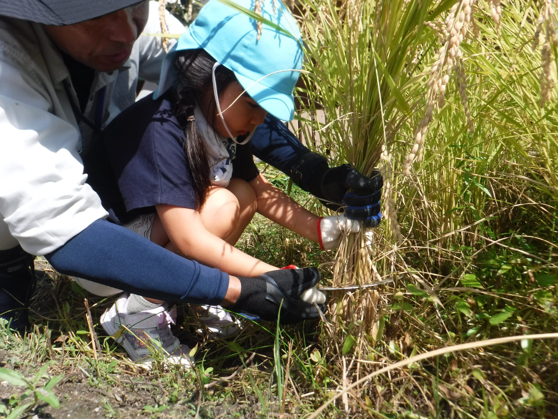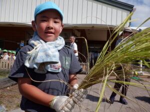 「稲刈りできたー」「鎌、怖かったけどお米博士と一緒だからできた」「ドキドキしたけどうまく刈れた」