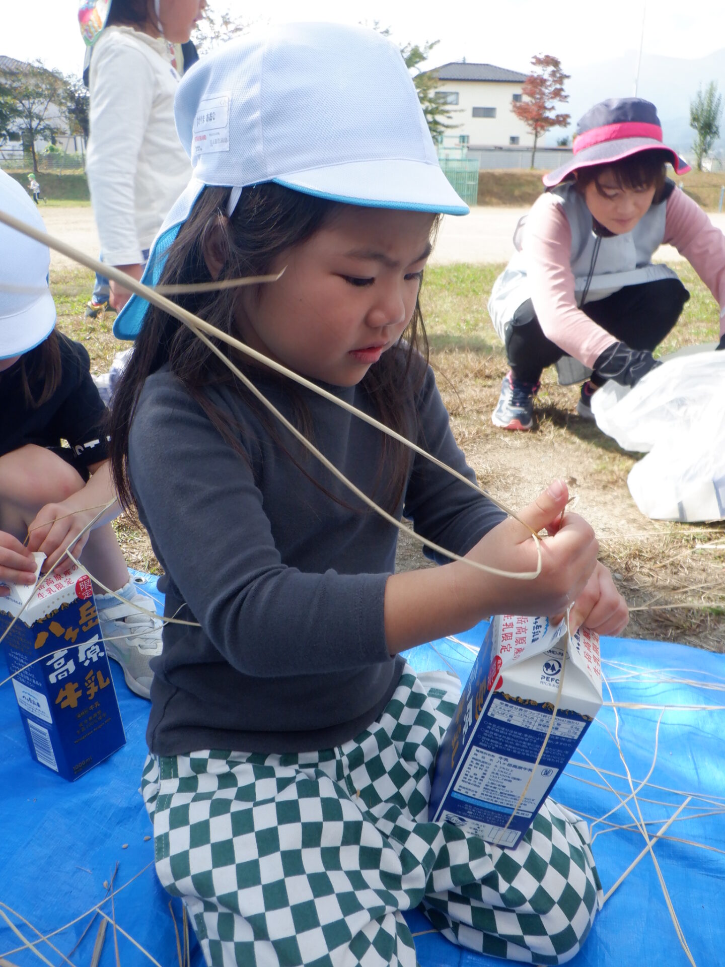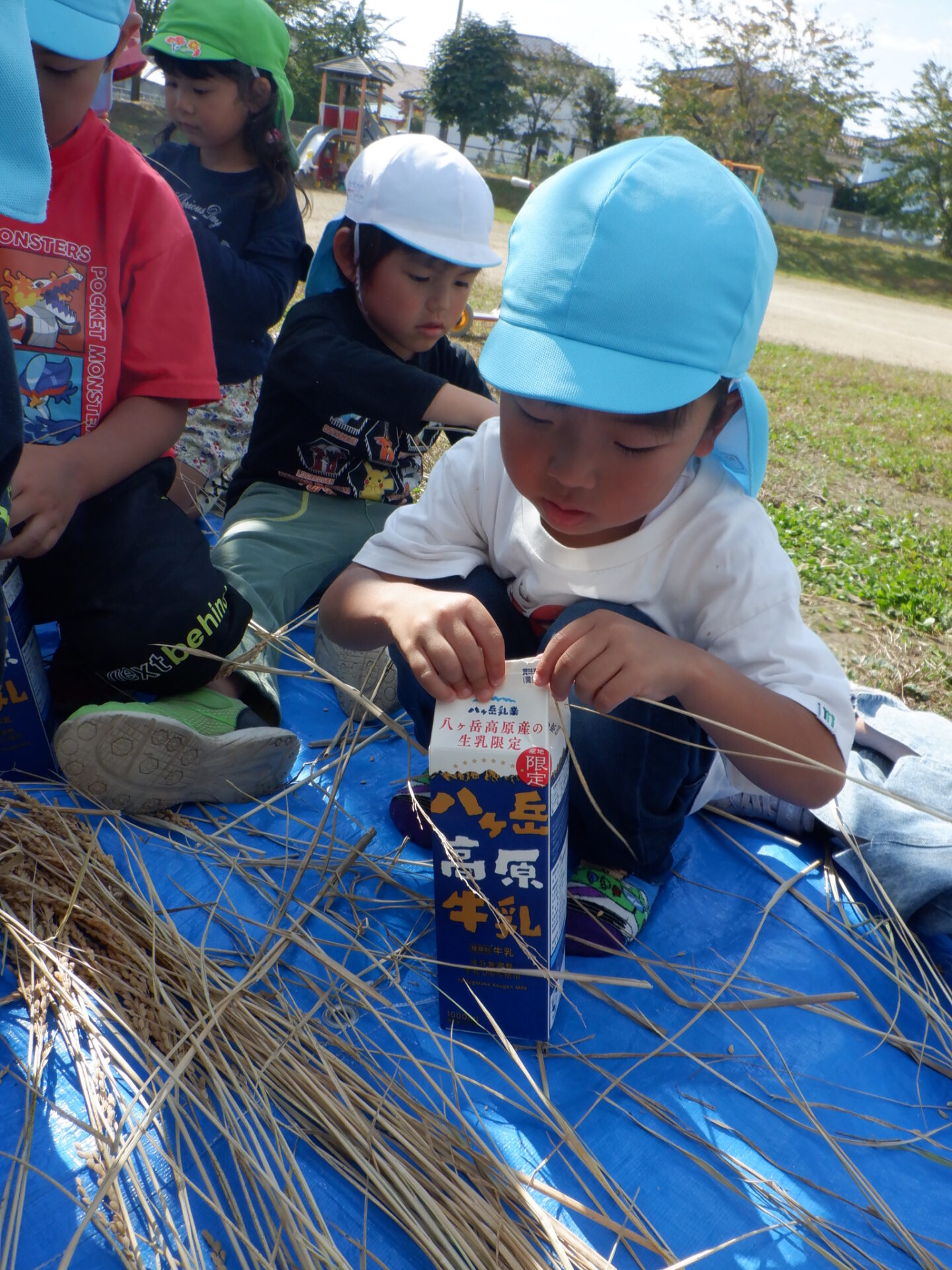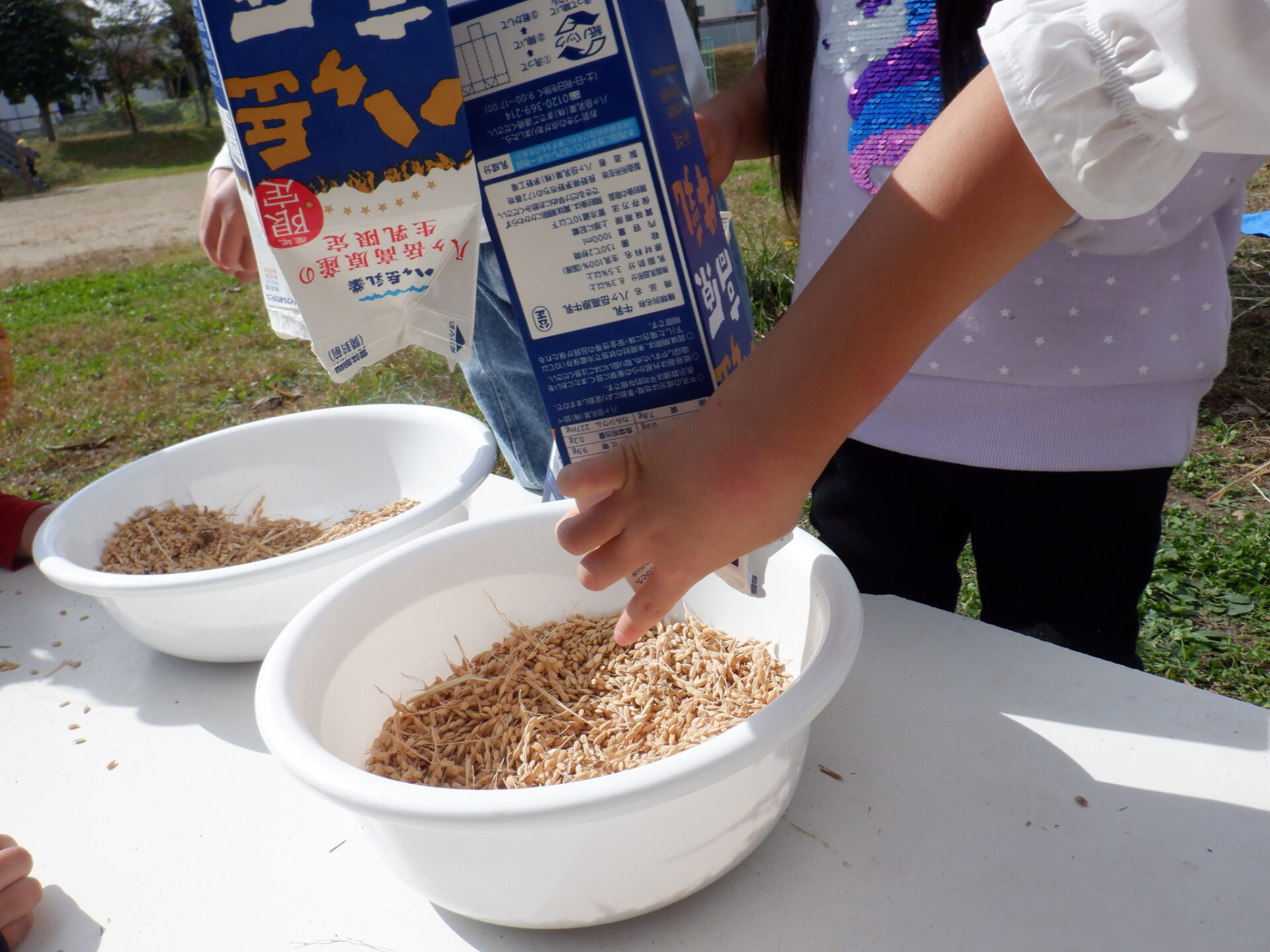 「どうやって取ろうか」「ひと粒づつ取る〜」「え〜〜大変だよ」「牛乳パックがあるよ」みんなで考えます。