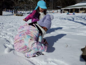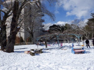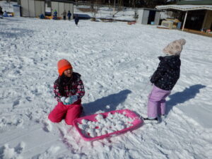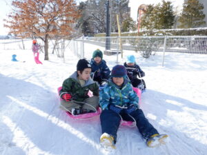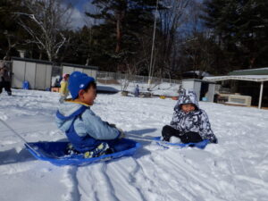 築山からソリで滑ったり、可愛い雪だるまを作ったり、友達と一緒に元気に雪遊びを楽しみました。