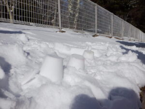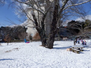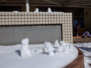 「雪、降らないね」「いつ降るのかな?」「雪降ったらかまくら作るんだ!」「ソリやりたい!」「雪だるま作りたいなー」と、楽しみに待っていた子ども達待望の雪が積もりました。