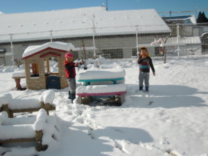 庭一面に、白い雪が積もり、子どもたちは大喜びですぐに外に出て雪遊びを始めました。