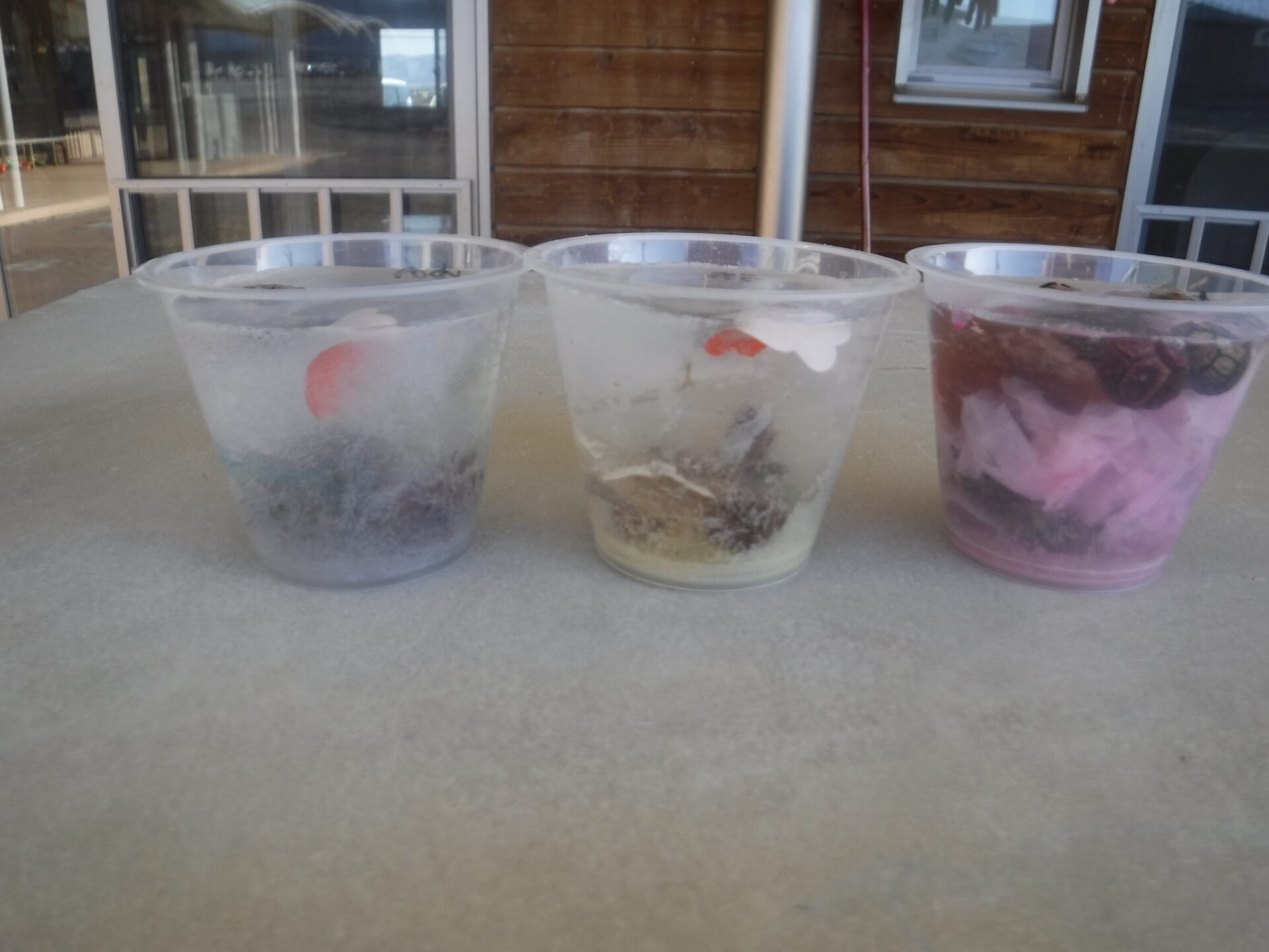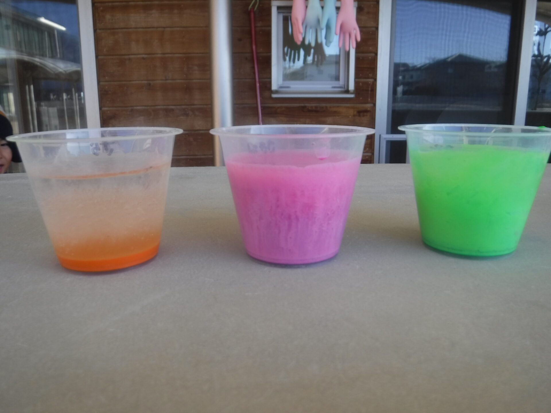 翌日、「わあーカチコチ!」とさっそく色氷の様子を眺めたり、カップから出して触って楽しみます。「つめた〜い」「きらきらひかってる!」