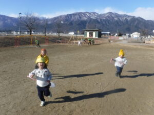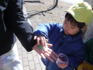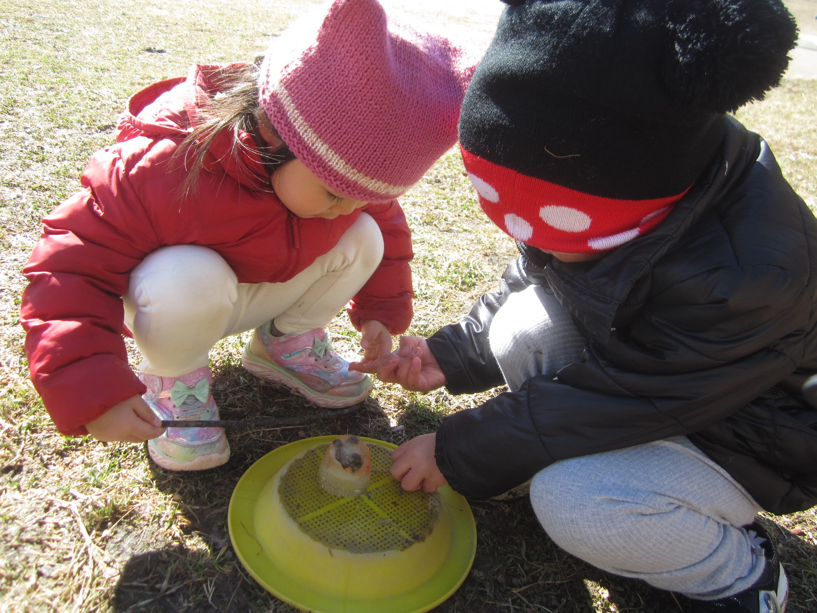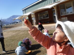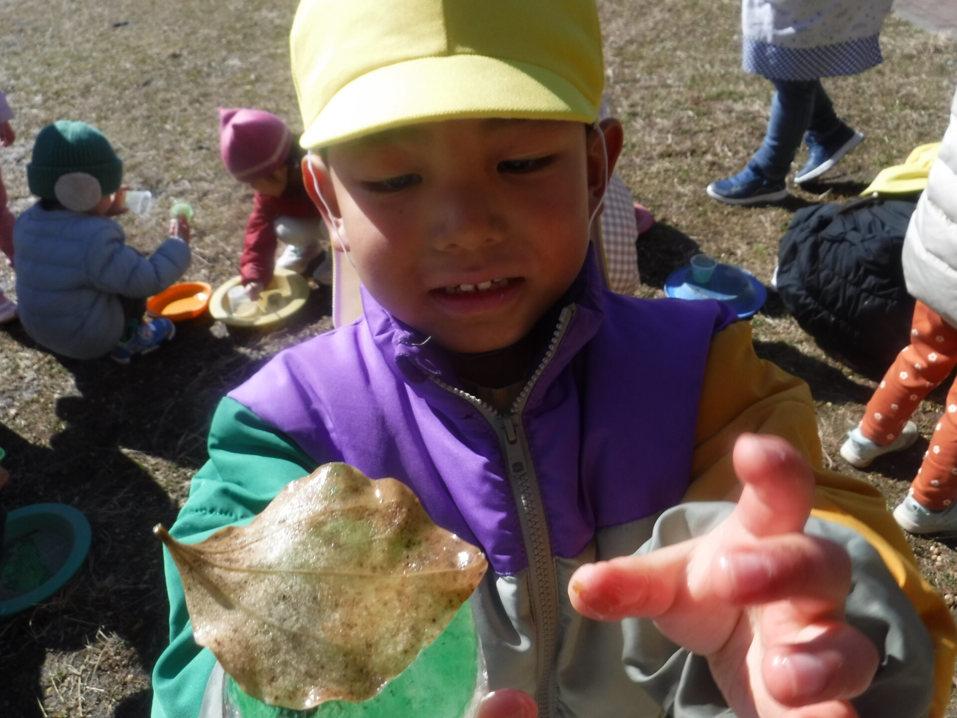 氷あそびを通して、見たり感触を楽しんだりしながら身近な自然事象に興味を持つことができました。また、自分たちで好きな色、形に氷が作れることも知ったり、木の実や葉っぱも取り入れて楽しみながら、この時期ならではのあそびに親しむことができました.寒い季節ですが、戸外で体をたくさん動かしながら、元気いっぱい楽しんでいきたいと思います。