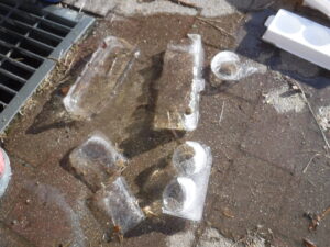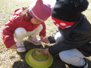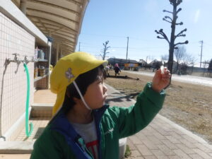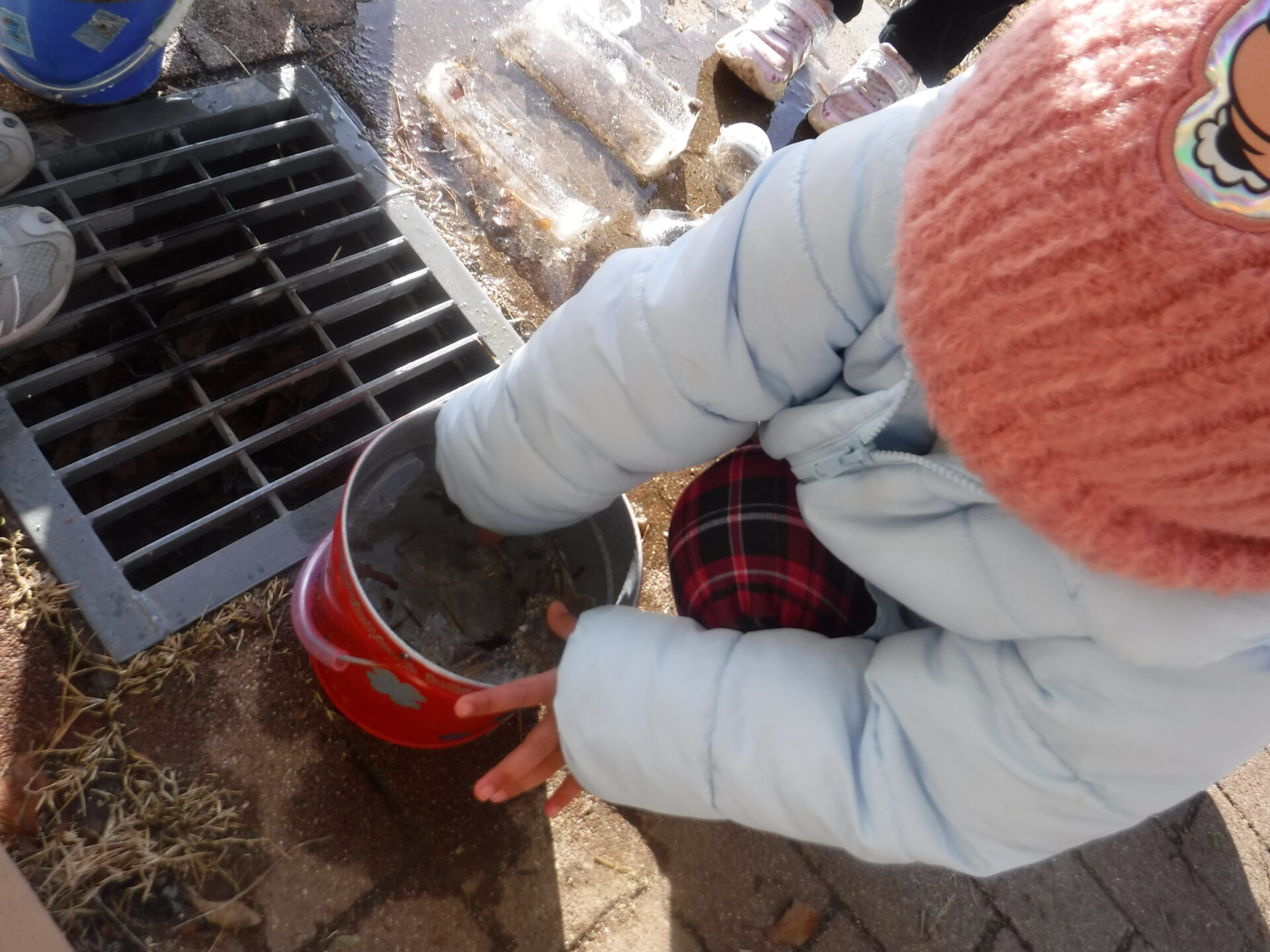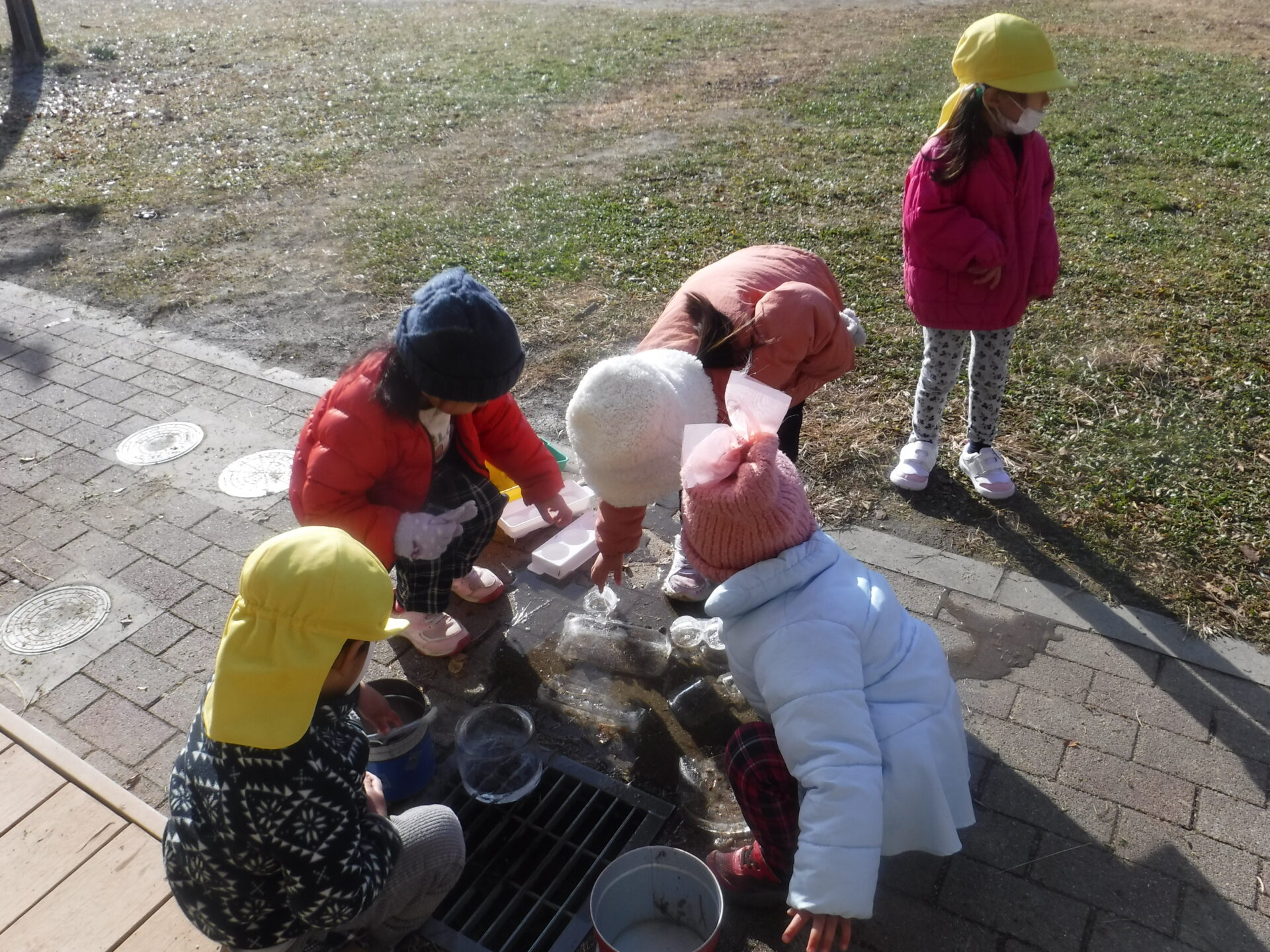 雪が降った翌日、屋根から雪解け水がポタポタと落ちてくるのを見て、缶バケツを下に置いて溜めて楽しんでいた子どもたち。翌朝、戸外に置いてあったバケツの水が凍っていることを発見! 割ったり、触ったりして遊びました。