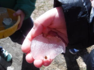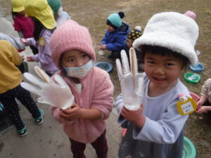 保育士が作った手ぶくろの氷にも驚きながら氷あそびを楽しみました。