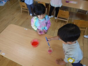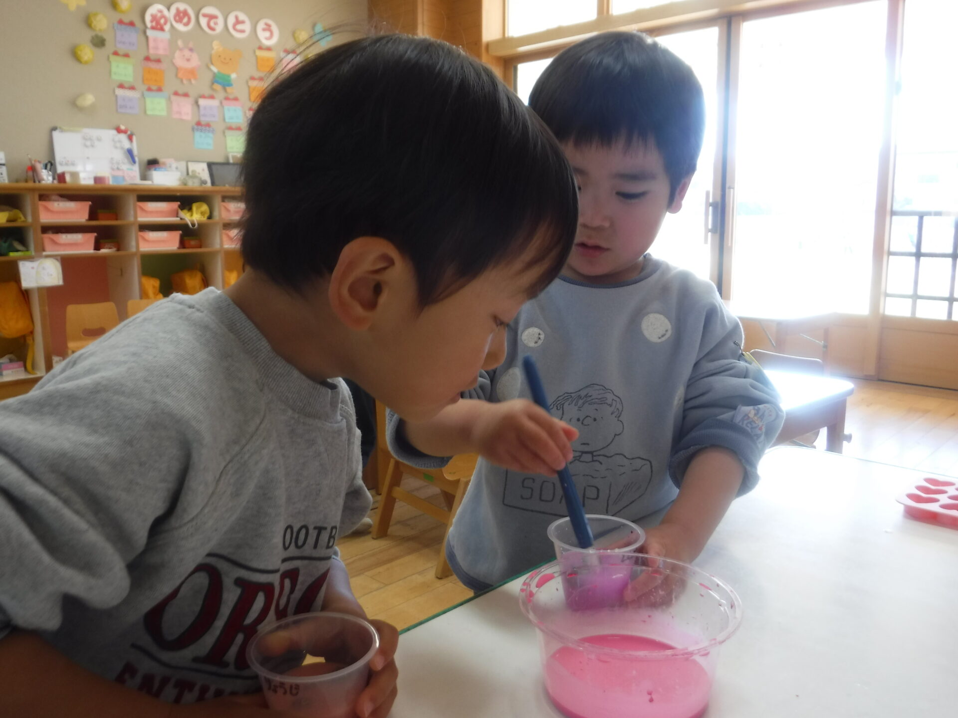 「もっとこおりがほしいな」と、こおりが気に入った様子!みんなで氷作りに挑戦しました。「ピンクのこおりにしたい!」