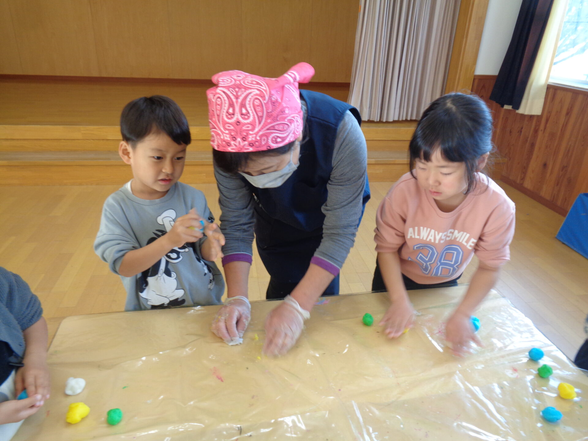 蒸して捏ねた米粉に食紅を入れ、赤・黄・緑・青・白の繭玉を作りました。