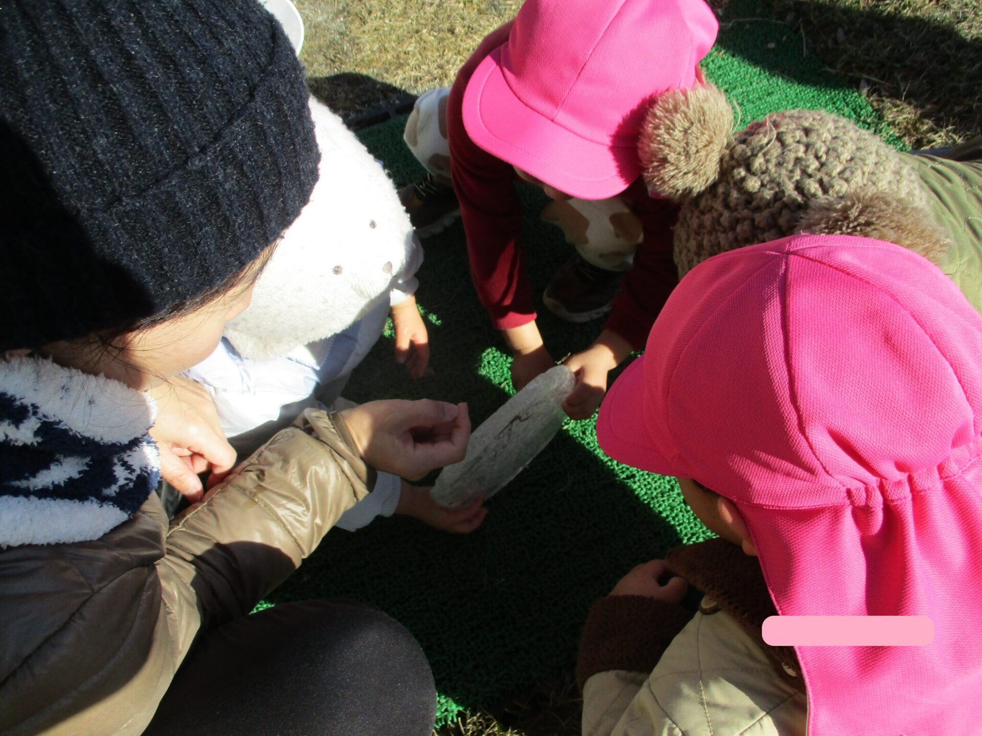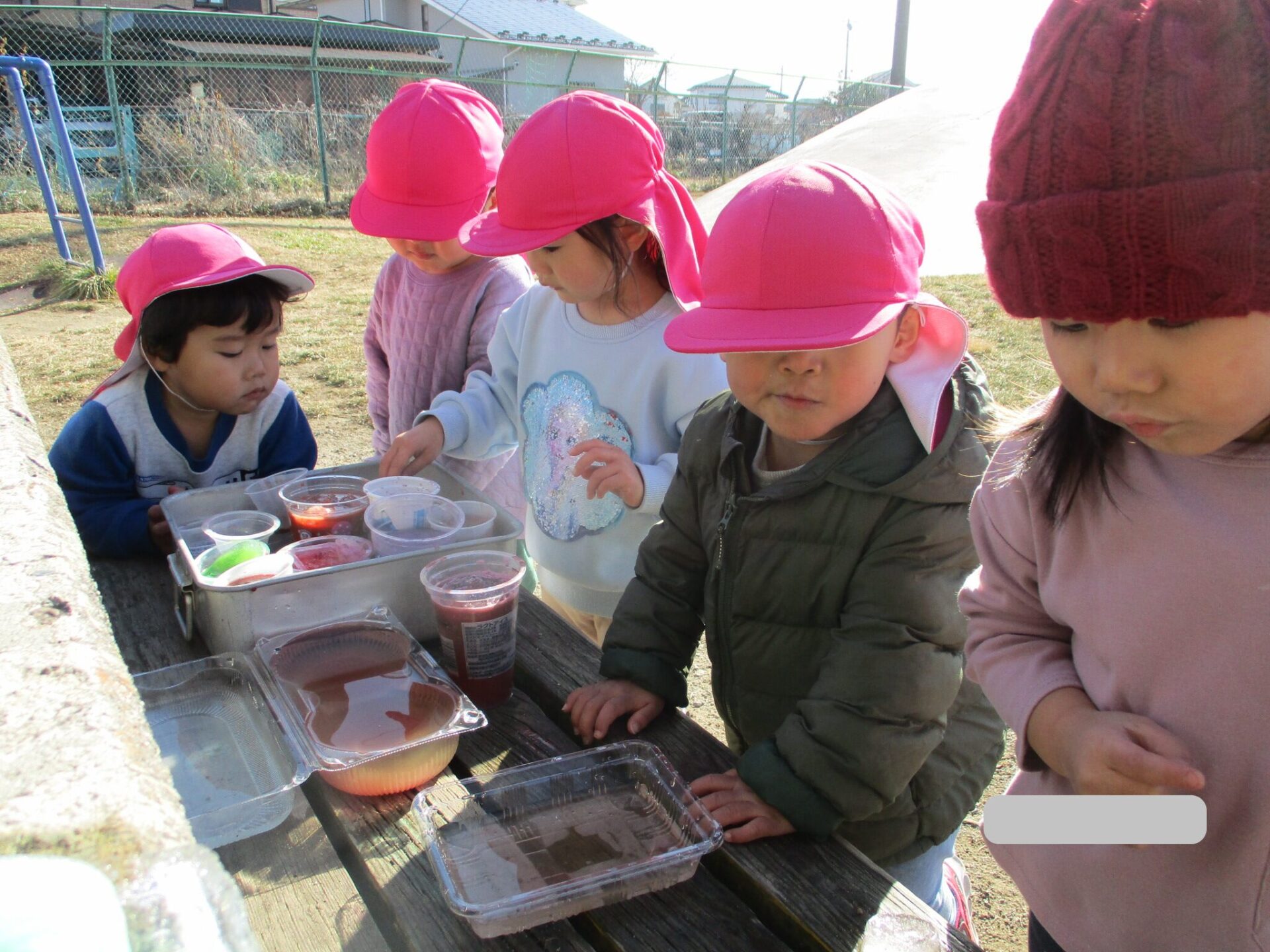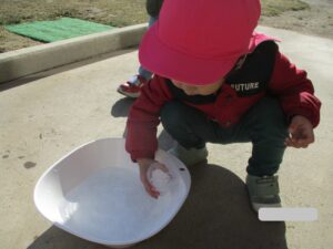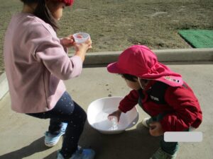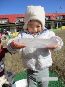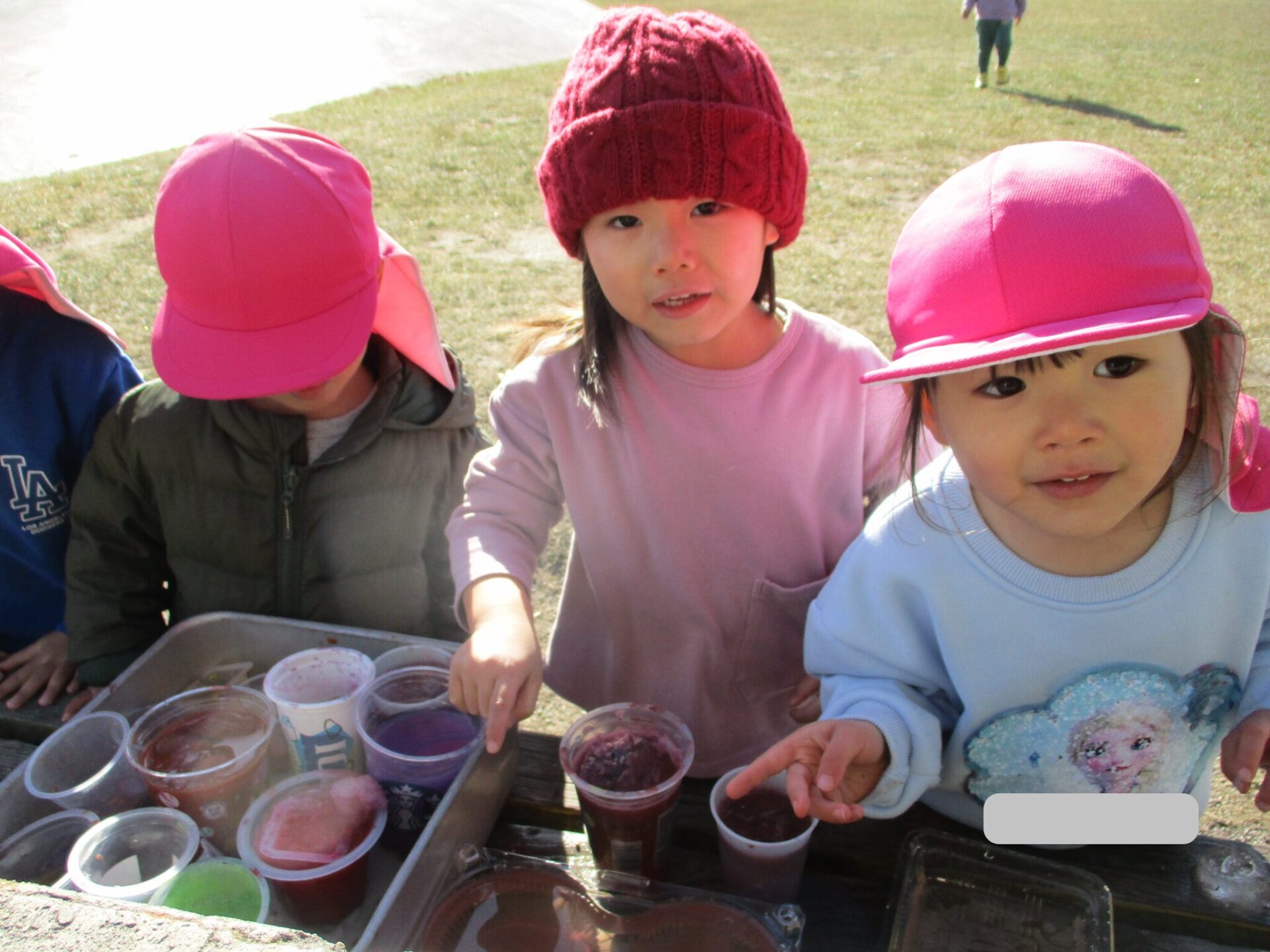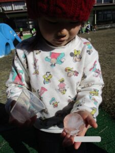 友だちやお兄さんお姉さんたちの遊ぶ様子をよく見ている2歳児さん。なんでもやってみたい!と好奇心旺盛で年長さんのかき氷屋さんの雪が溶けてできた氷を見つけ「きれいだね。」「作ってみたいね。」と冬の自然に興味をもっていました。