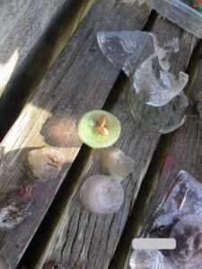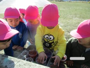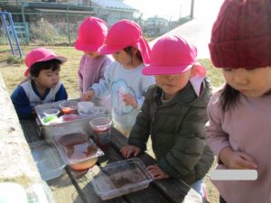 戸外で遊んでいると・・・前の日に年長さんが、かき氷屋さんをしてくれたカップを発見しました。