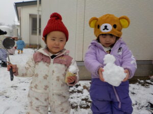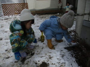 雪や氷は暖かくなると解けてなくなってしまいます。子ども達が雪や氷に触れたという経験も忘れてしまうのかもしれません。でも雪や氷が水になって土に染み込みエネルギーとなるように、自分でやってみた経験はその子の心と体のエネルギーになるのではないでしょうか。信州の冬は厳しいけど楽しい経験もたくさんできます。その一端を味わうことができました。この経験を踏まえて次の冬も雪や氷遊びを楽しみたいと思います。