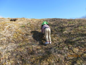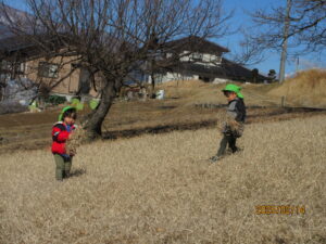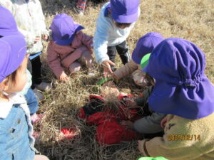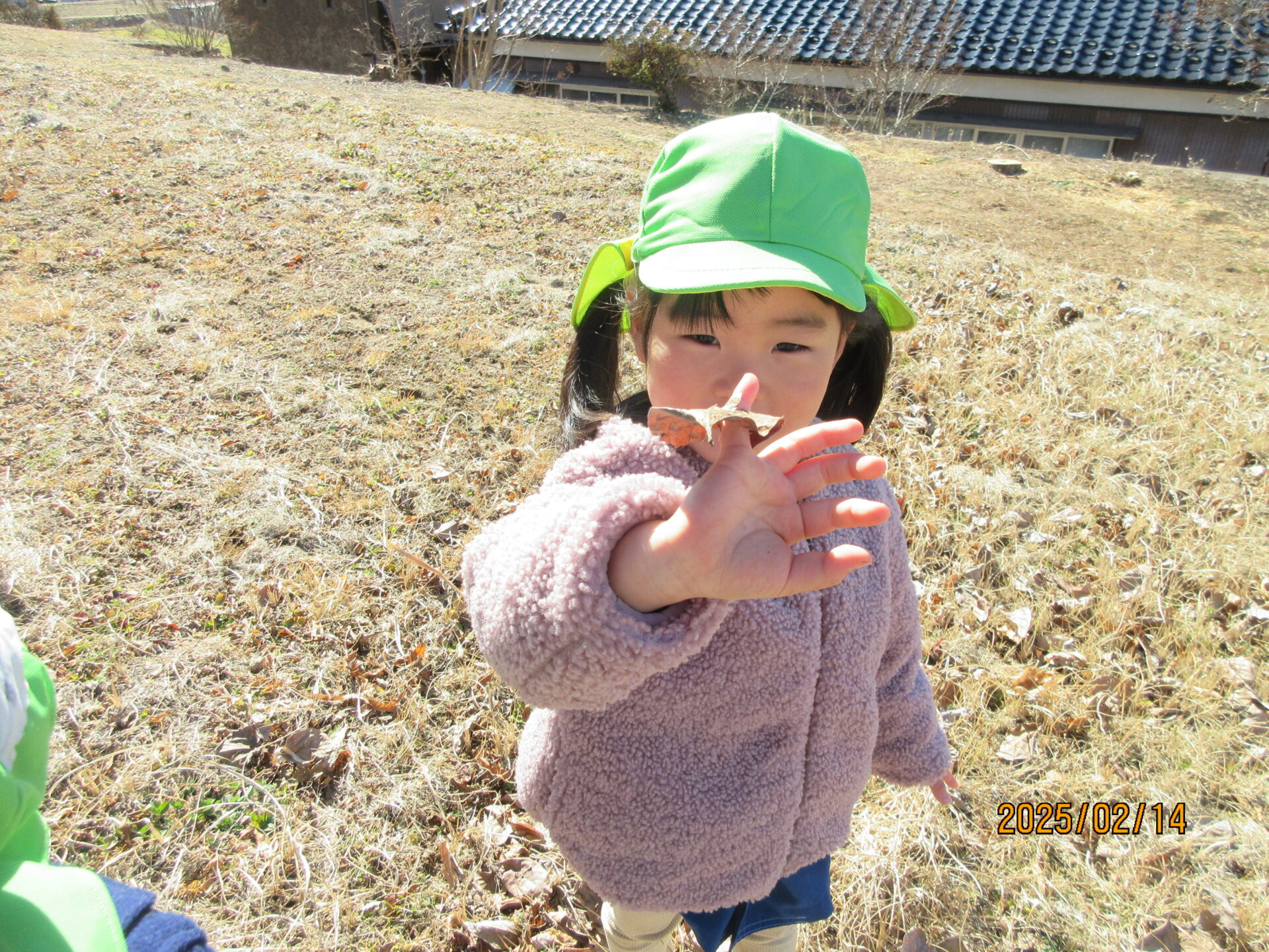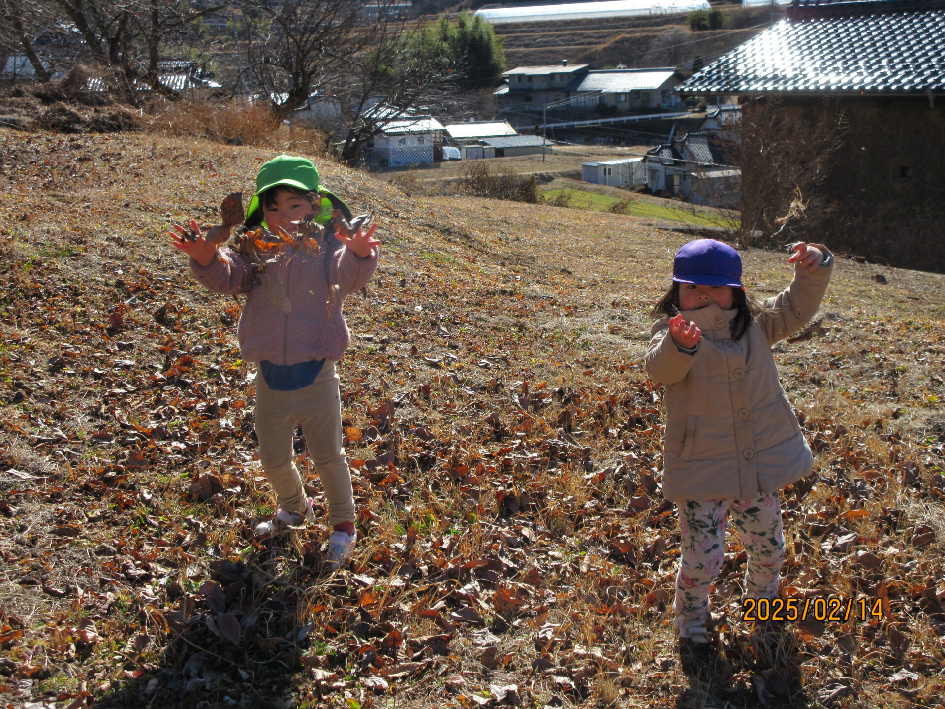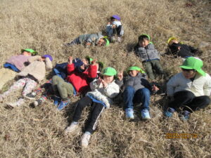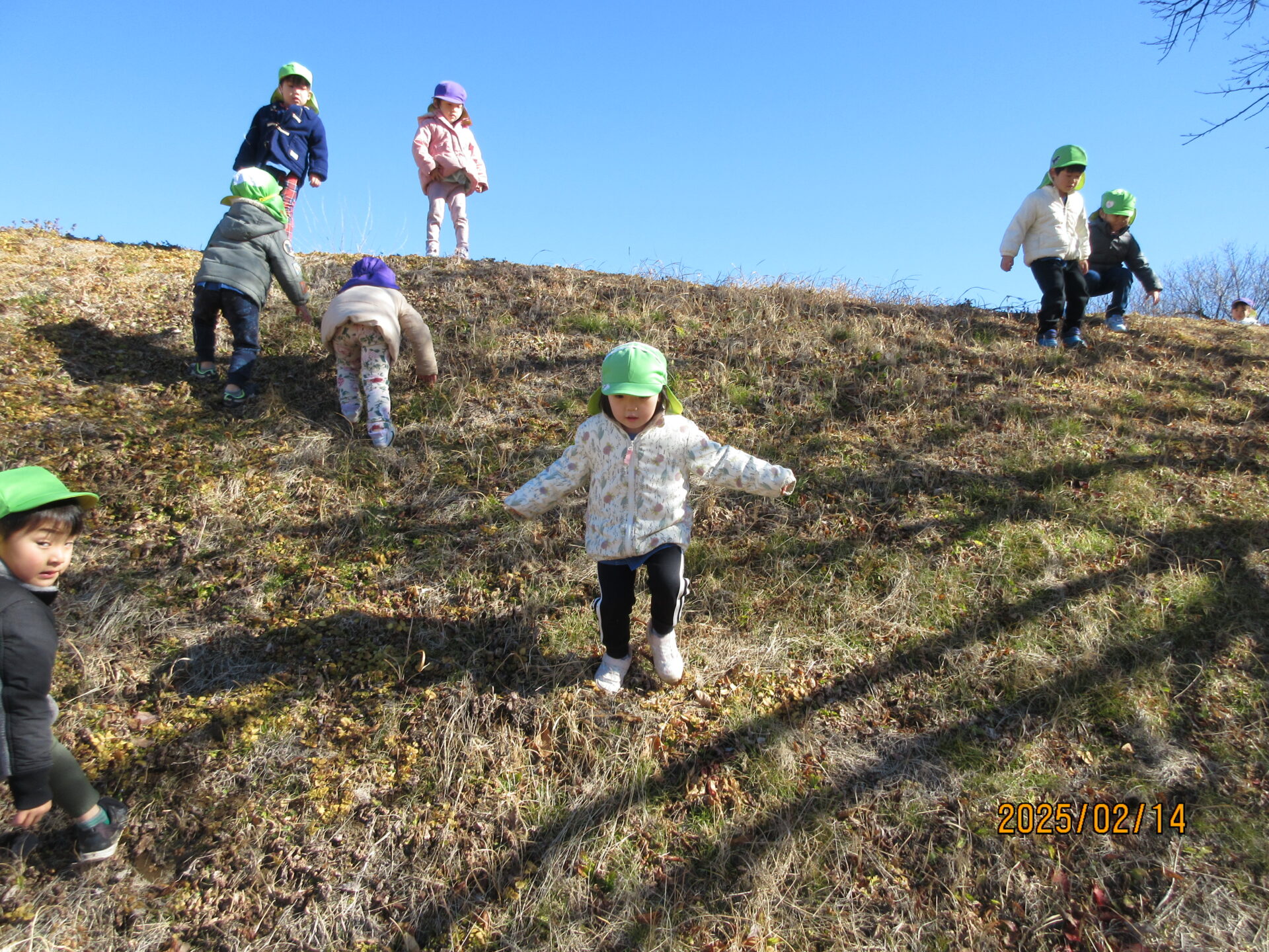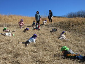 ・公園や遊具がなくても遊べる楽しさを感じてもらえたらと土手に向かうと走り回ったり坂を慎重に降りたり転がったり友だちと枯れ葉をかけあったりと思いっきり楽しんでいた子ども達。「汗かいた〜!」 「また行きたい。」という声も聞こえ、冬でも体を動かすと体が温まるということを感じられたのではと思う。