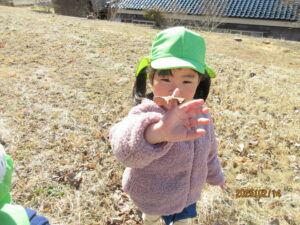 ・冬は寒くてなかなか戸外に出られず部屋にこもって遊ぶことが多くなってしまっている。暖かい日に散歩に誘うと「寒いから嫌だ。」という子もいたが、未満児と手をつなげるとわかって、張り切る姿も見られた。